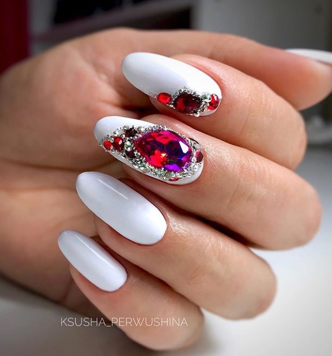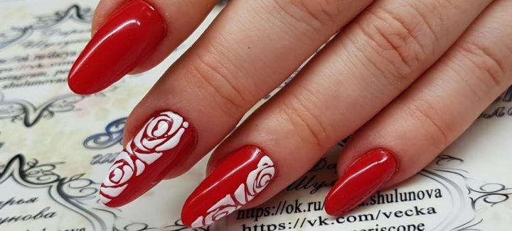 Алый цвет – классика, не утрачивающая актуальности среди модниц. Простое, но эффектное решение – равномерно покрыть пластины красным лаком и закрепить яркий нейл-дизайн блестящей втиркой. При желании сделать маникюр с рисунком можно изобразить крупное алое сердце на белоснежном фоне. Дополнительным декором выступят стразы, выложенные по краям сердечка.