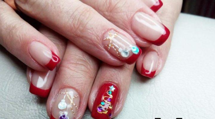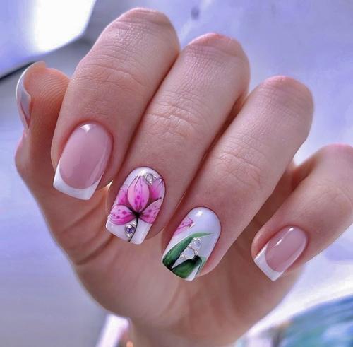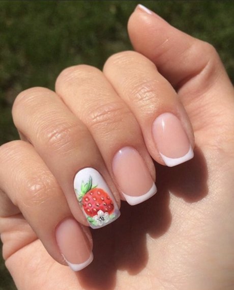 И последний модный тренд в дизайне френч — это украшение одного или нескольких ноготков рисунками цветов, фруктов или ягод.