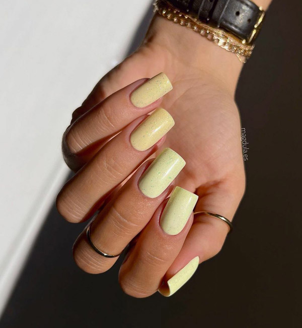 Желтый цвет ассоциируется с солнцем и теплом. Яркий оттенок летнего маникюра поможет добавить энергии и органично впишется в пляжную тематику. Особенно эффектно смотрится покрытие ногтей бархатистой пудрой соответствующего оттенка, ассоциирующейся с песком. На фактурной основе изображают вдавленный след от стопы.