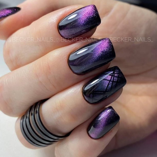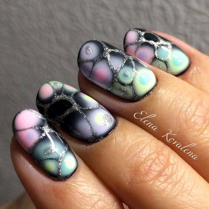- очаровательный градиентный переход в монохромном или разноцветном исполнении. Можно наносить на отдельные пластины продольно или по горизонтали, а также создавать переход оттенков от пальца к пальцу;