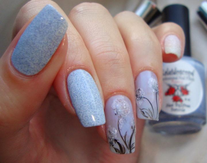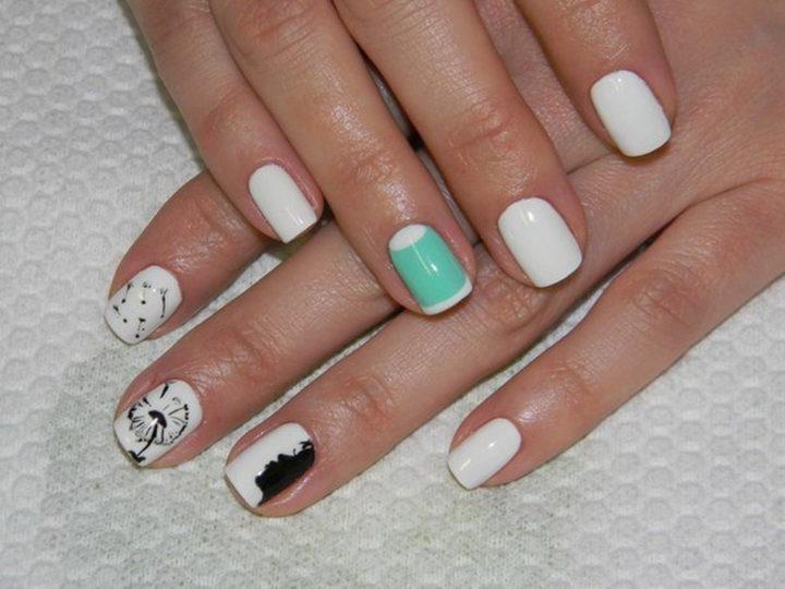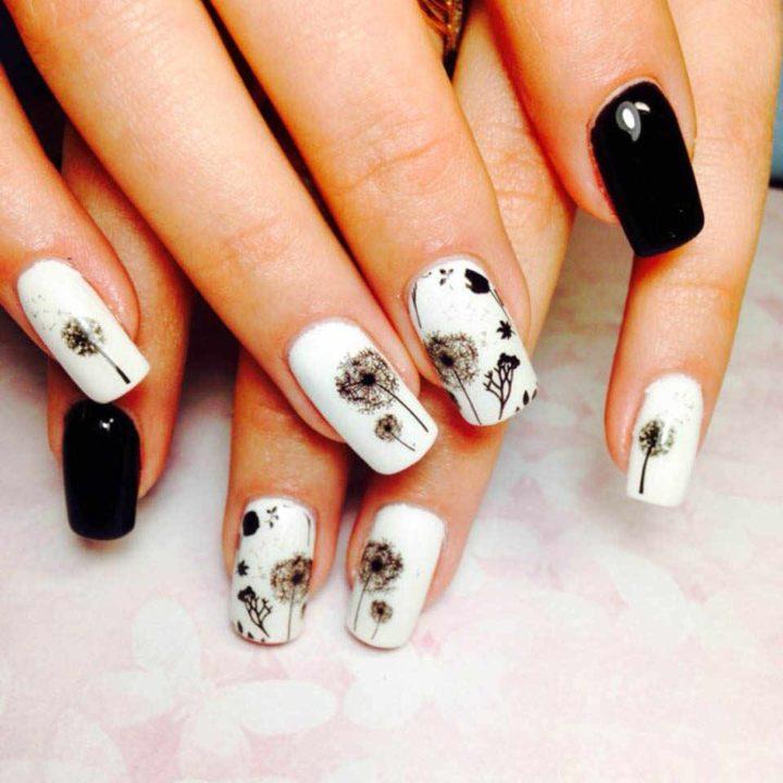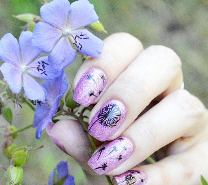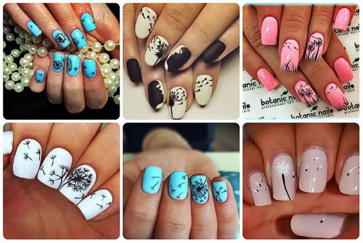 Идеи нейл-арт разнообразны: одуванчик может иметь разлетающиеся пушинки, а может быть целым цветком. Фон для создания рисунка может быть любой, но лучше всего сделать его ярким, ведь лето — это время красок.