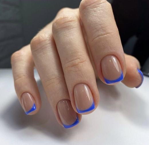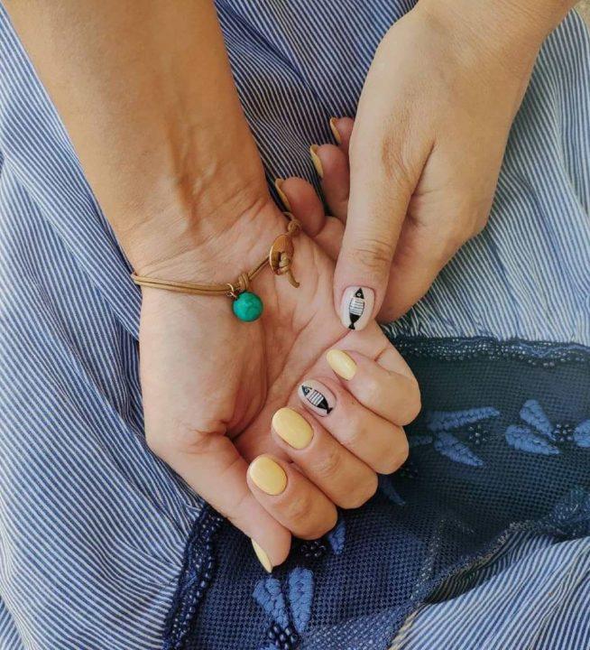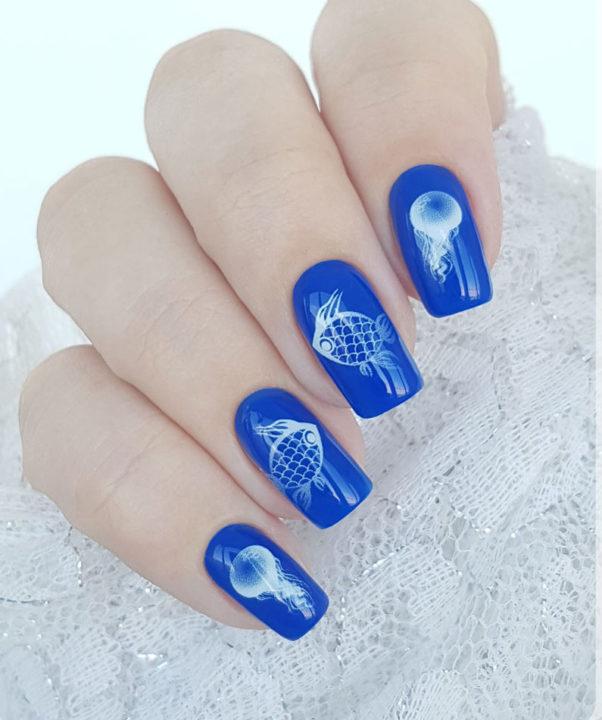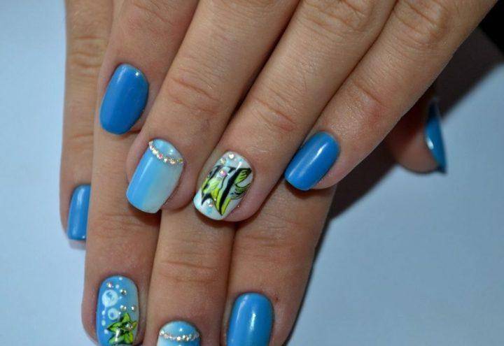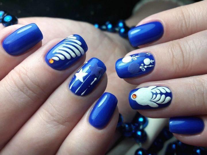 Маникюр 2023 года, выполненный в насыщенном голубом цвете, гармонично вписывается в морскую тематику. Ногти покрывают однотонным блестящим глянцем или наносят на них полоски, чередующиеся в белоснежном и голубом цвете. Поверх можно нанести рисунок в виде якоря, штурвала в золотистом либо серебристом оттенке. Альтернативное решение – прибегнуть к объемному декору в виде ракушки или морской звезды.
