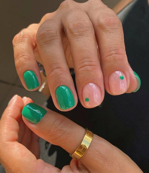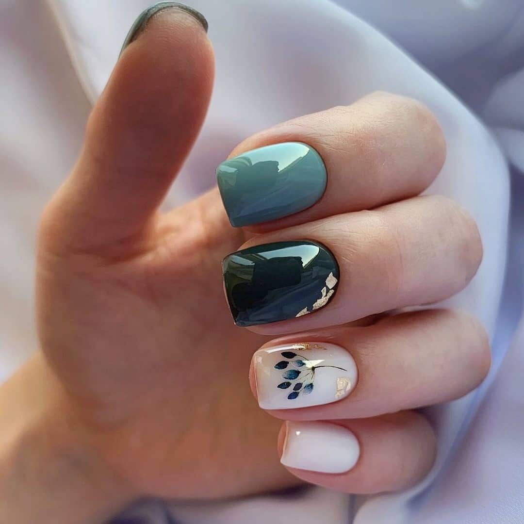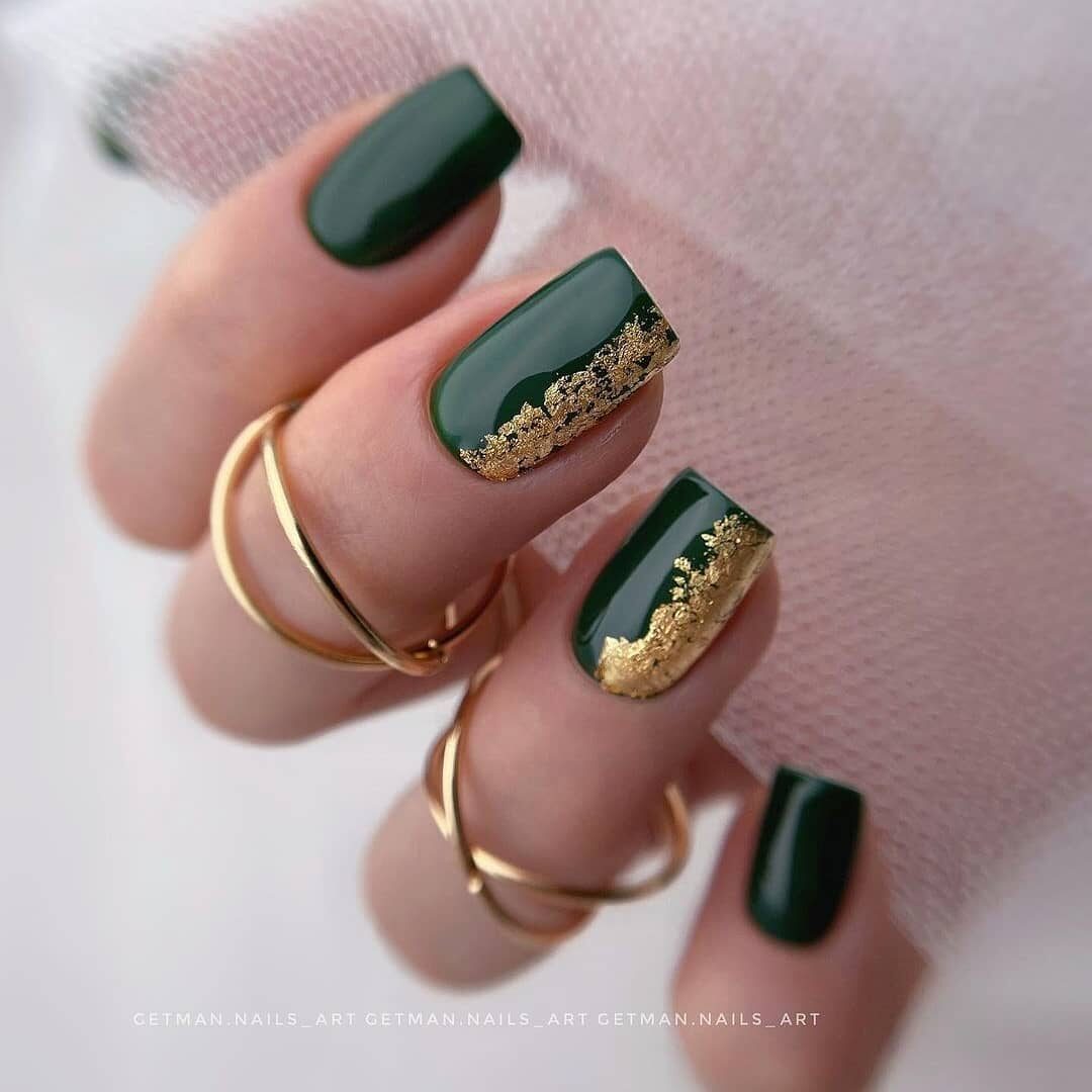 Глубокий зеленый цвет ассоциируется с лесными мотивами в осенний сезон. Оттенок придает маникюру элегантность и таинственность. Можно использовать подобный цвет в качестве фона, на который наносятся яркие желто-оранжевые листья.