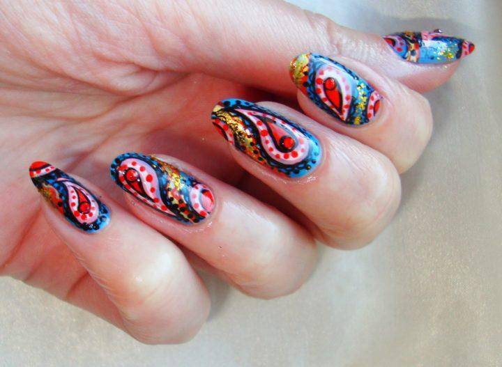 В использовании тем востока и этники в дизайне ногтей есть где разгуляться. Экспериментируя с рисунками и узорами, изобретая новые сочетания и используя трендовые цвета, можно сделать лучший модный летний маникюр. Яркие камни и стразы, использованные в таком стиле, будут интересно и уместно смотреться на черном фоне.