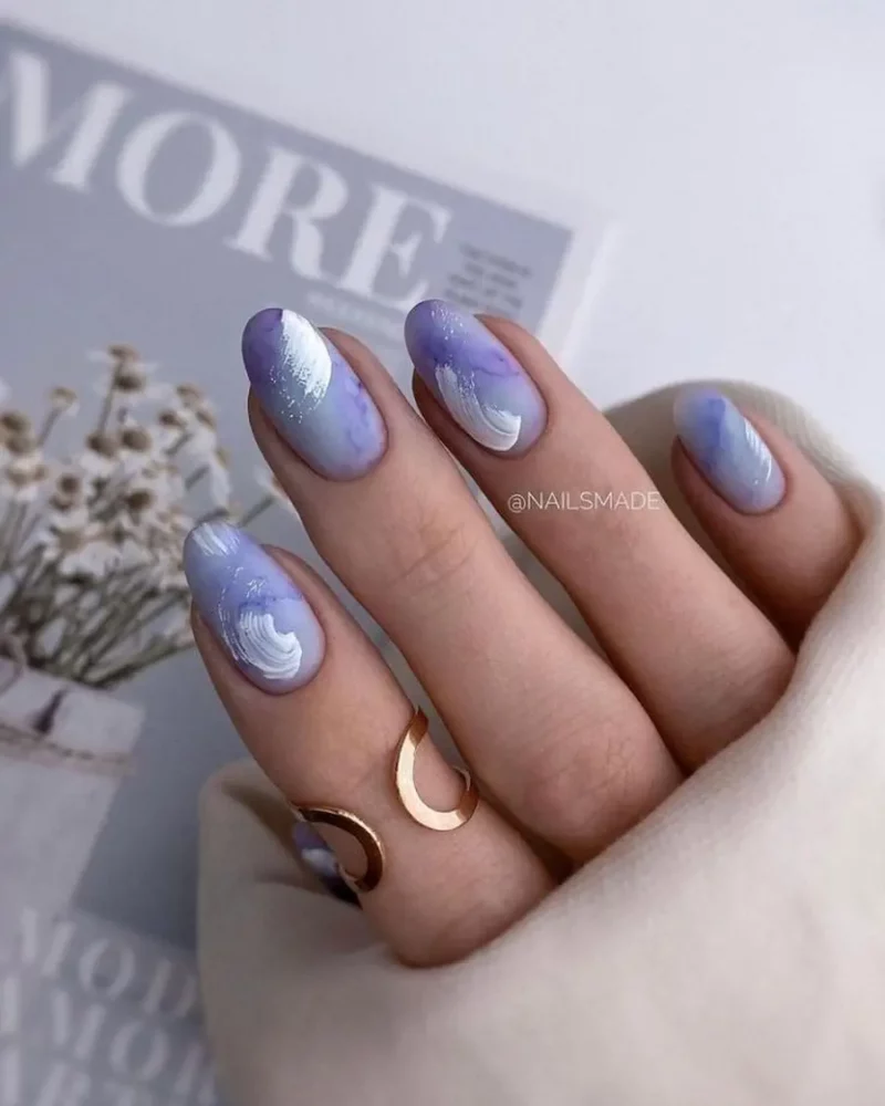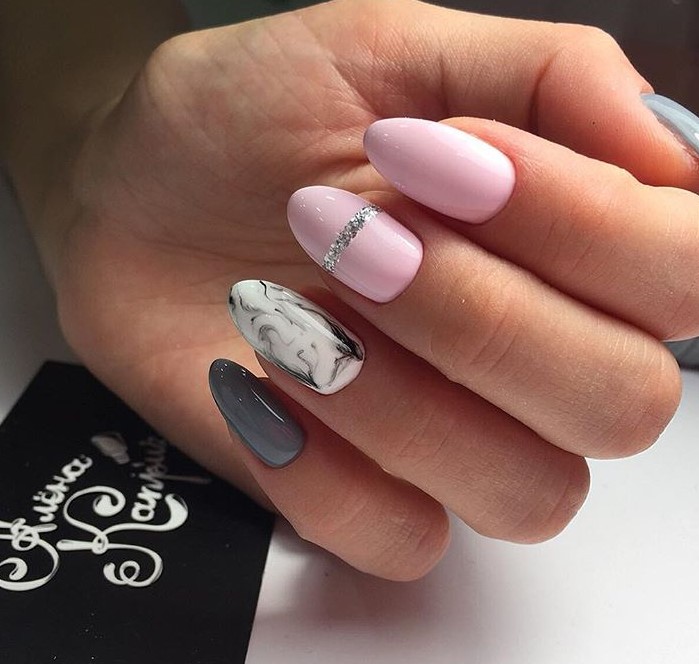 - Сделать визуально руки более женственными и легкими можно, нанеся на них дизайн, имитирующий мрамор. Лучше всего подойдут цвета, похожие на оттенки натуральных камней – синий или зеленый, голубой, розовый.