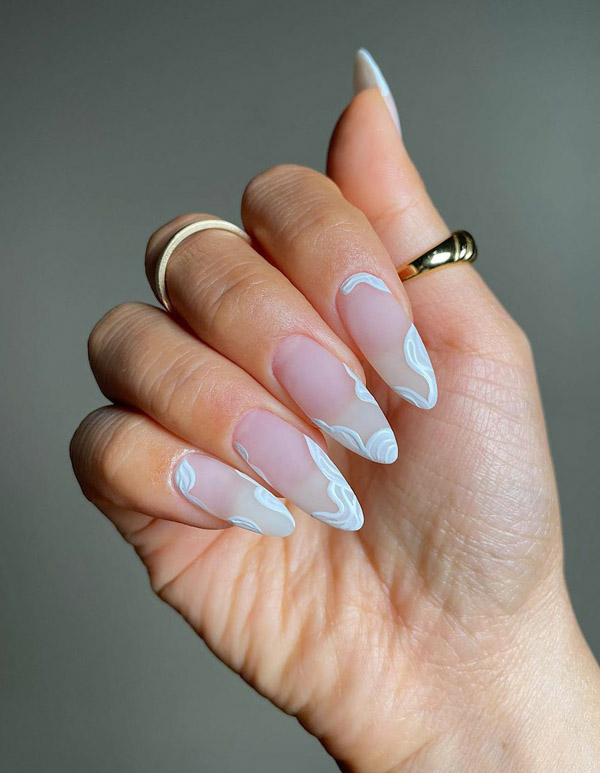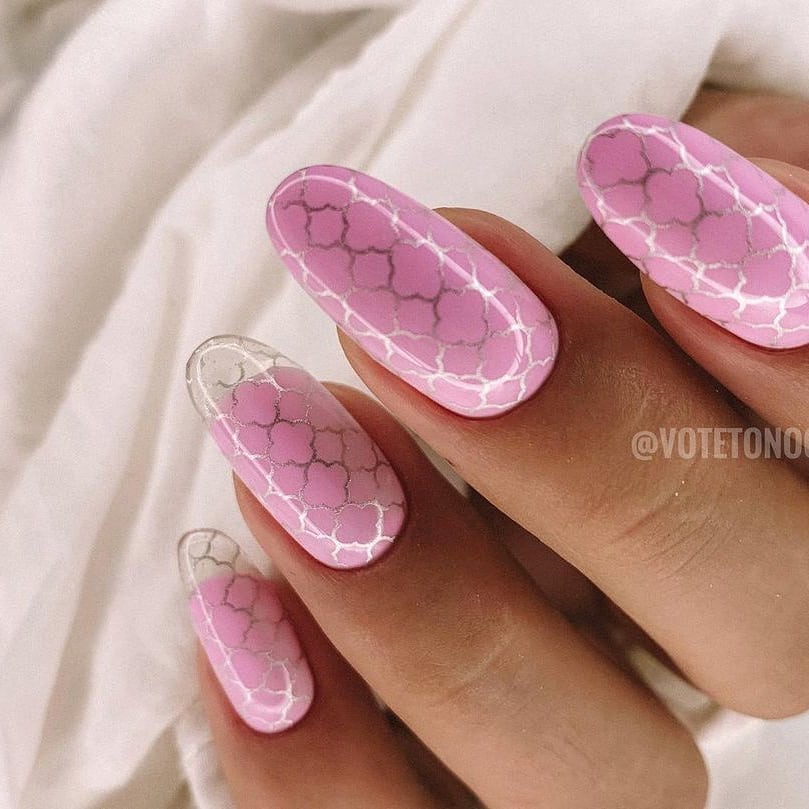Не стоит забывать о сочетании летних оттенков с тонким рисунком. Такой узор отдаленно напоминает эффект негативного пространства, что тоже будет вам на руку. Подобные узоры красиво смотрятся на втирке и голографических лаках.