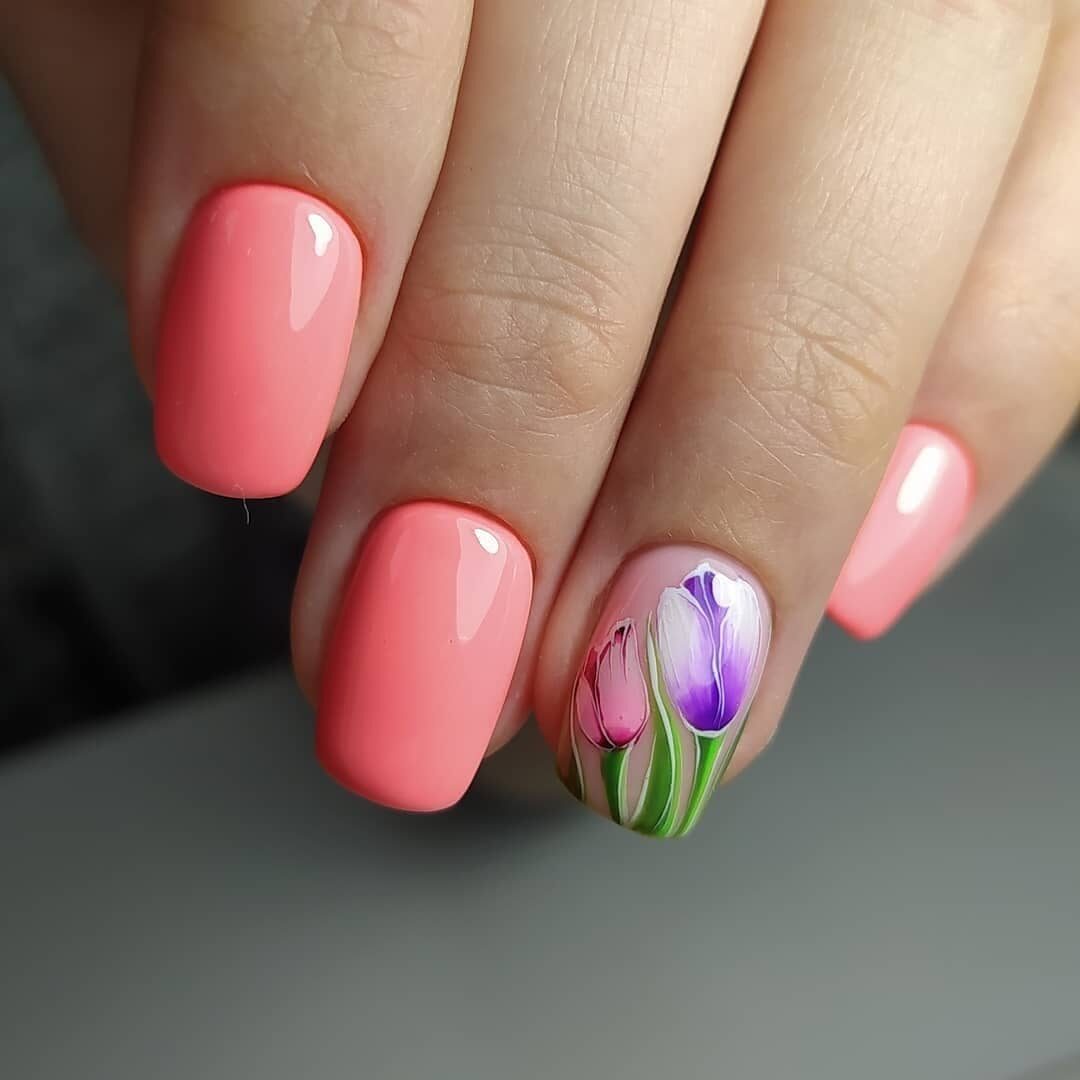 Для цветочного дизайна можно использовать классический красный оттенок. Также он отлично подойдет для популярного фруктово-ягодного дизайна маникюра на лето . Чтобы придать сочности и объема можно расставить акценты в виде капелек.