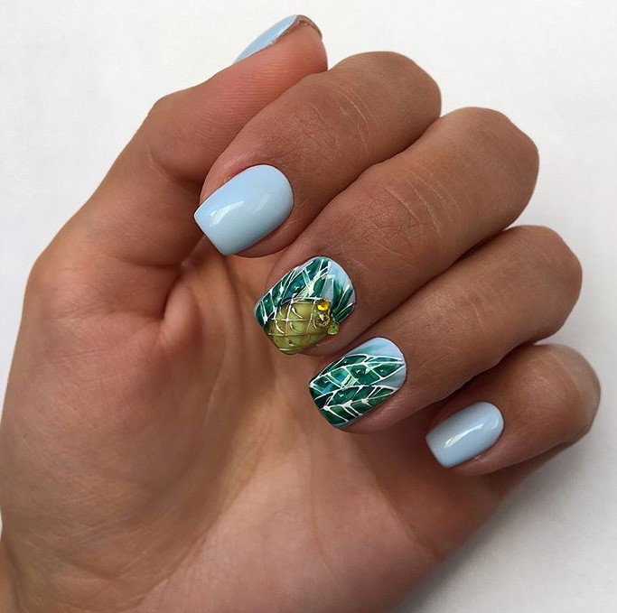 Украсьте свои ногти яркими джунглями и природными рисунками, переливающимися всеми оттенками зелёного цвета. Нарисуйте крупные листья и цветы, добавьте яркости и оригинальности, добавив к рисункам блёстки, фольгу и втирку. Пейзажи с пальмами — прекрасный дизайн для летнего маникюра. Изобразите пальмы тонкими линиями в стиле минимализма или вместите на ногтях целый пейзаж