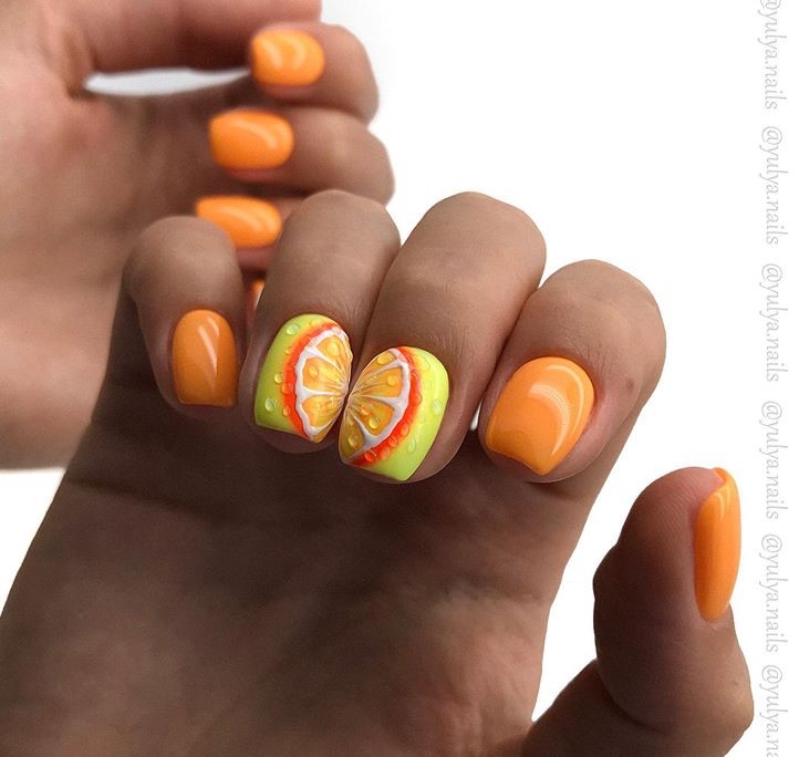 Благодаря использованию специальных техник нанесения на ногти 3-D рисунков, тенденция летнего маникюра с изображением фруктов не просто осталась популярной, но и перешла на новый уровень. Нарисованные лимоны, арбузы и прочие фрукты стали более реалистичными и объемными, к тому же в качестве дополнительного декора к ним добавились сочные капельки.
