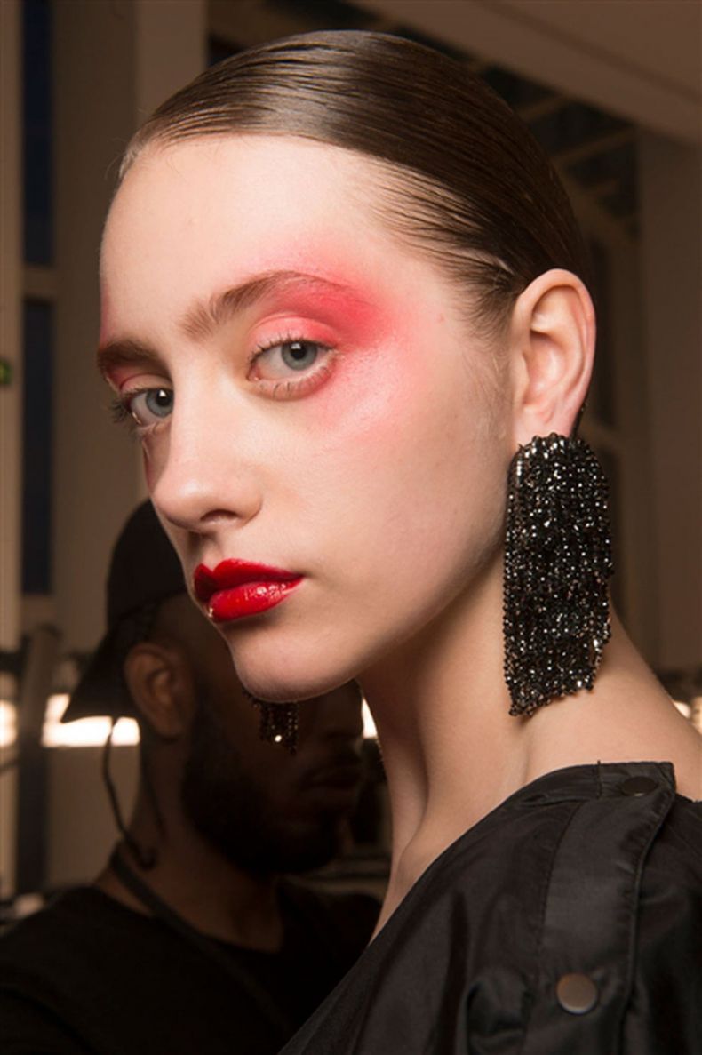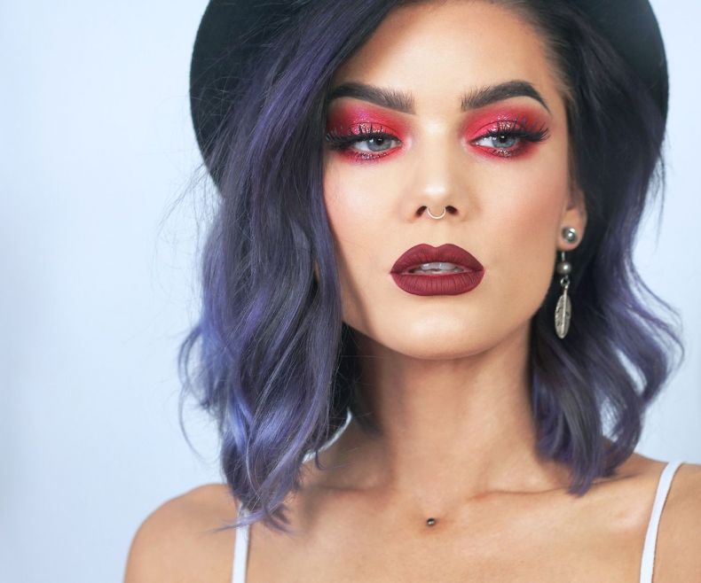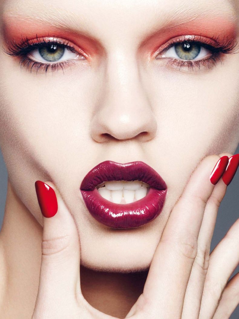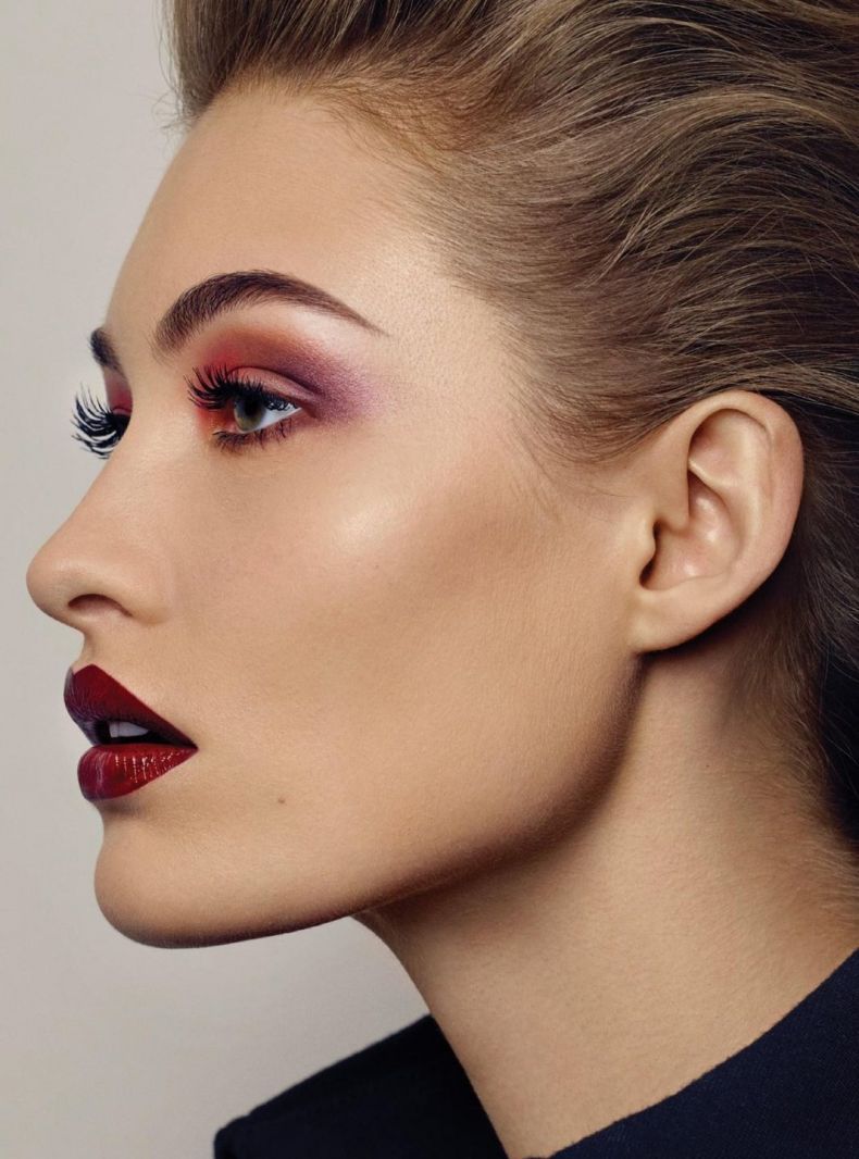 Макияж с использованием насыщенного и темно-красного цвета лучше всего выглядит на обладательницах светлых волос.