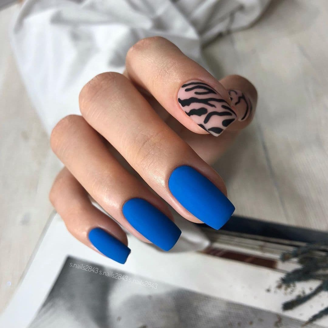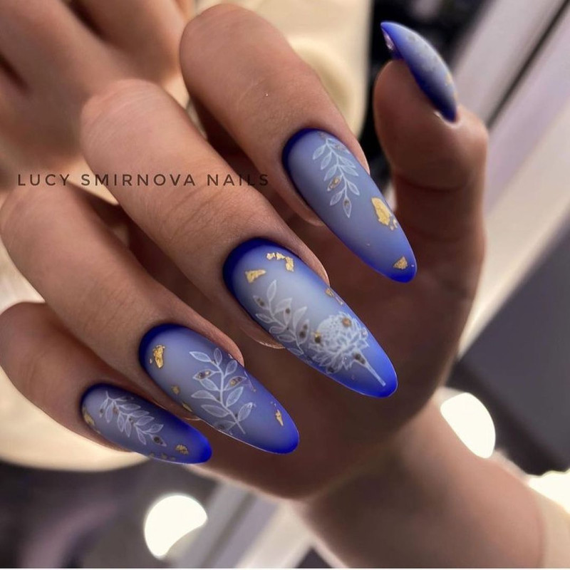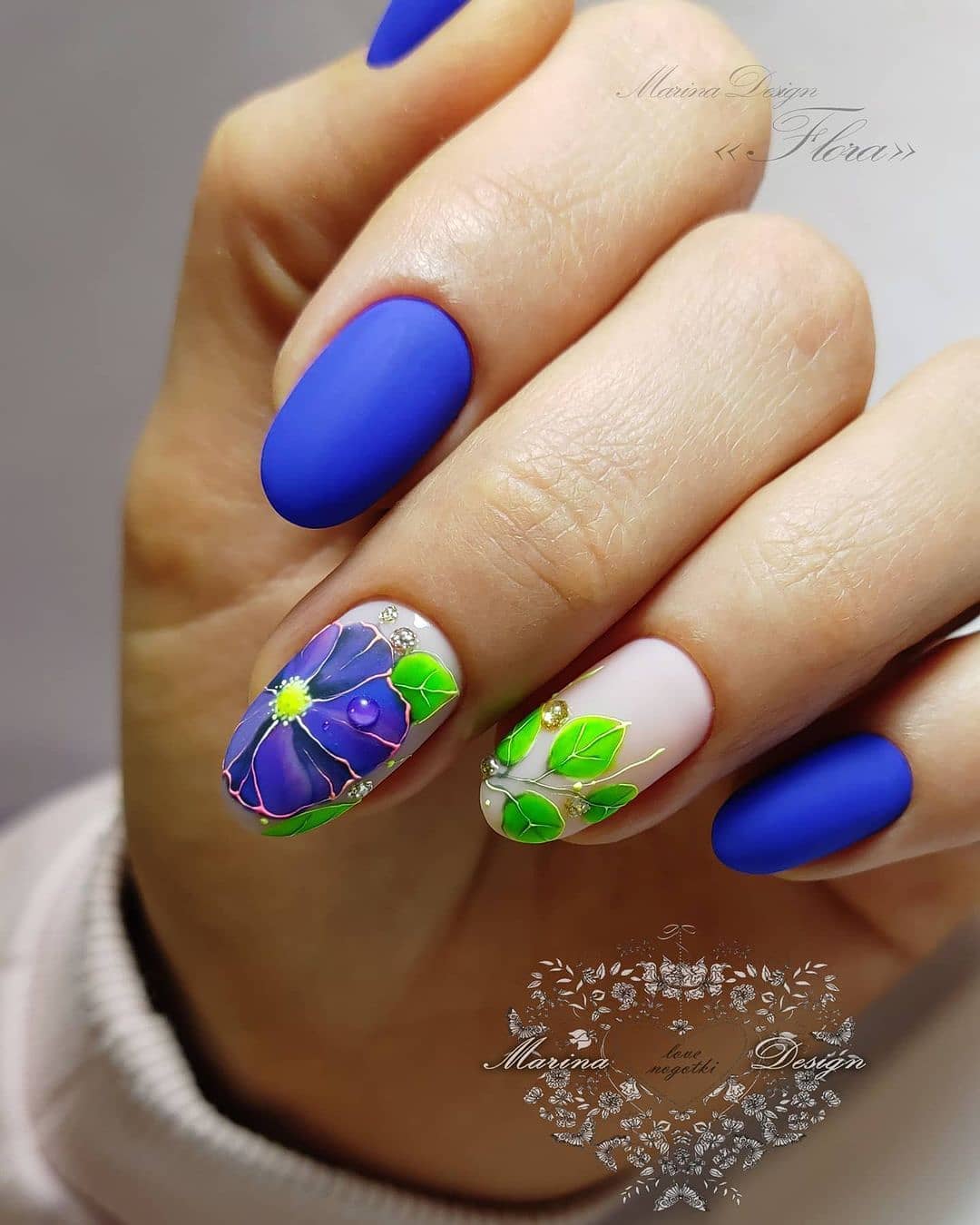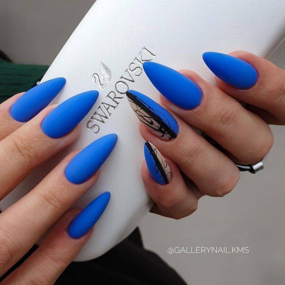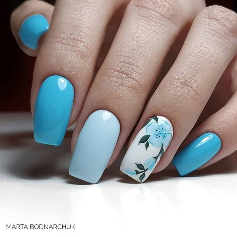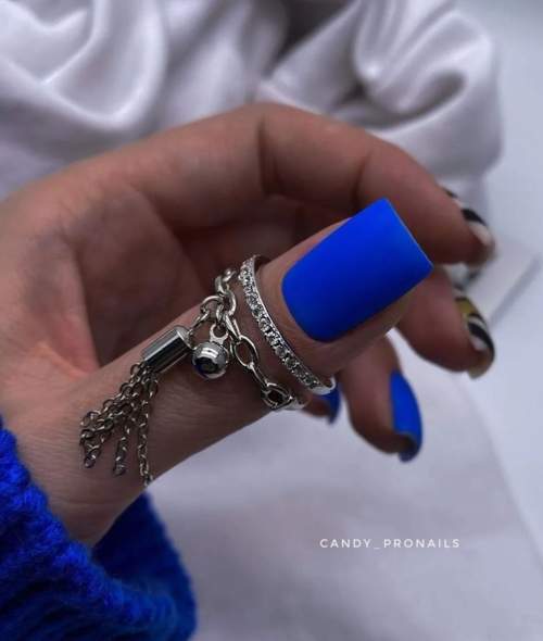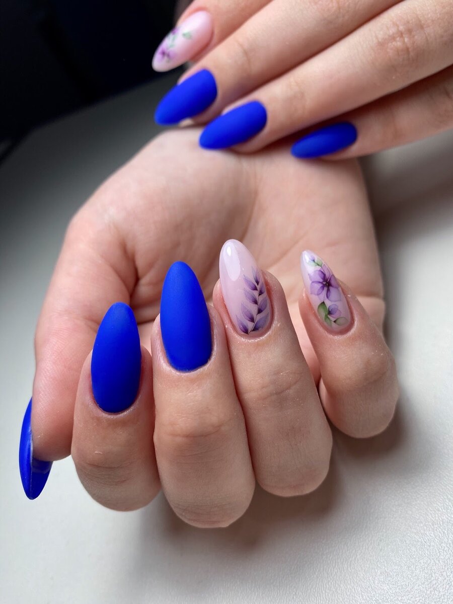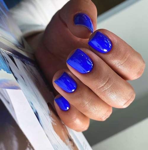 В ярко-синем цвете могут быть цветы, облака, френч, популярный эффект моря на ногтях или что-то необычное, оригинальное — что придумать сможет мастер или вы.