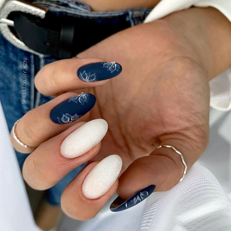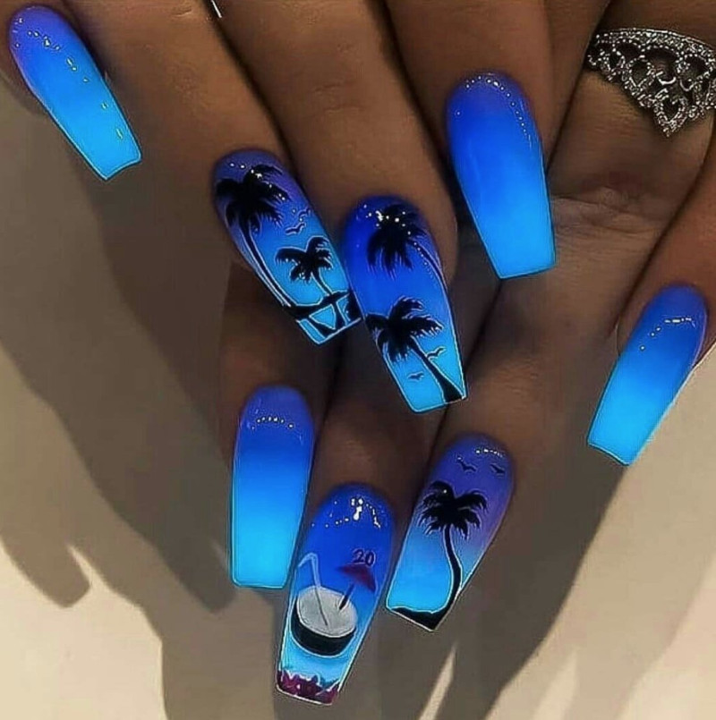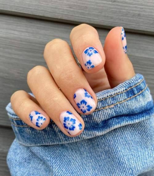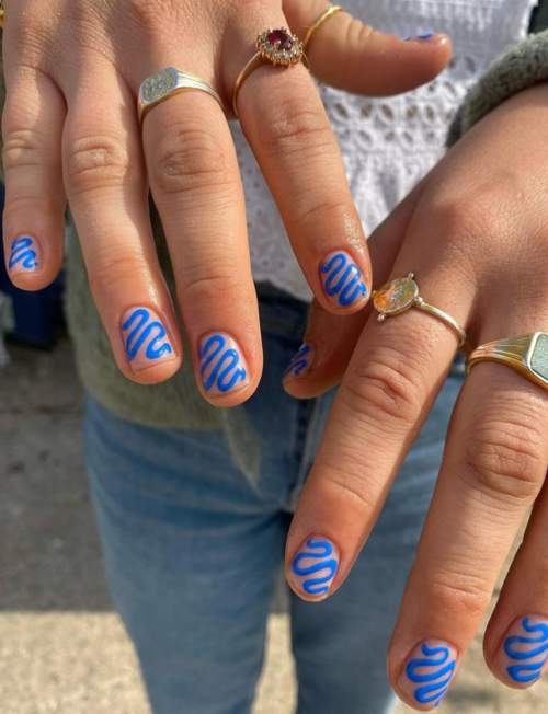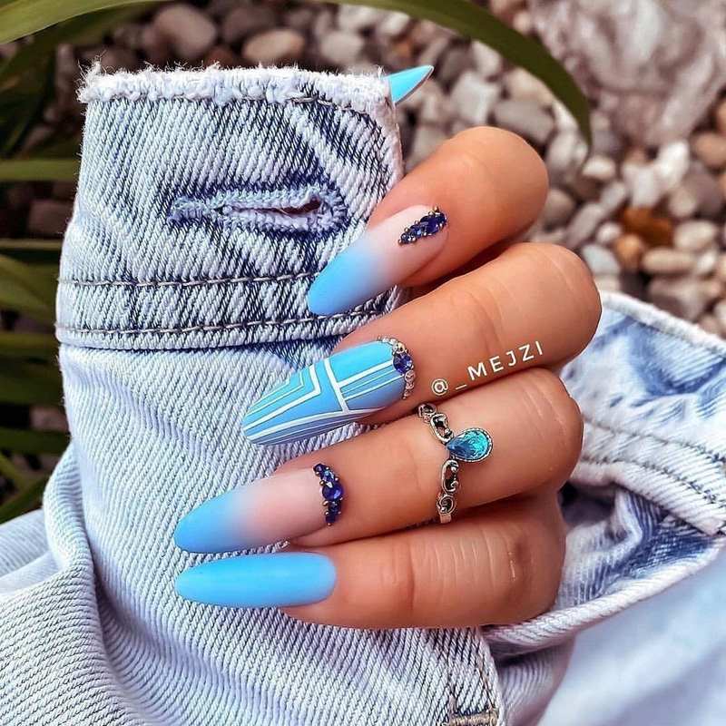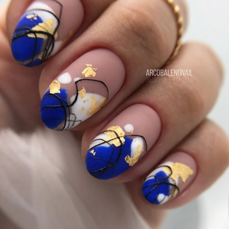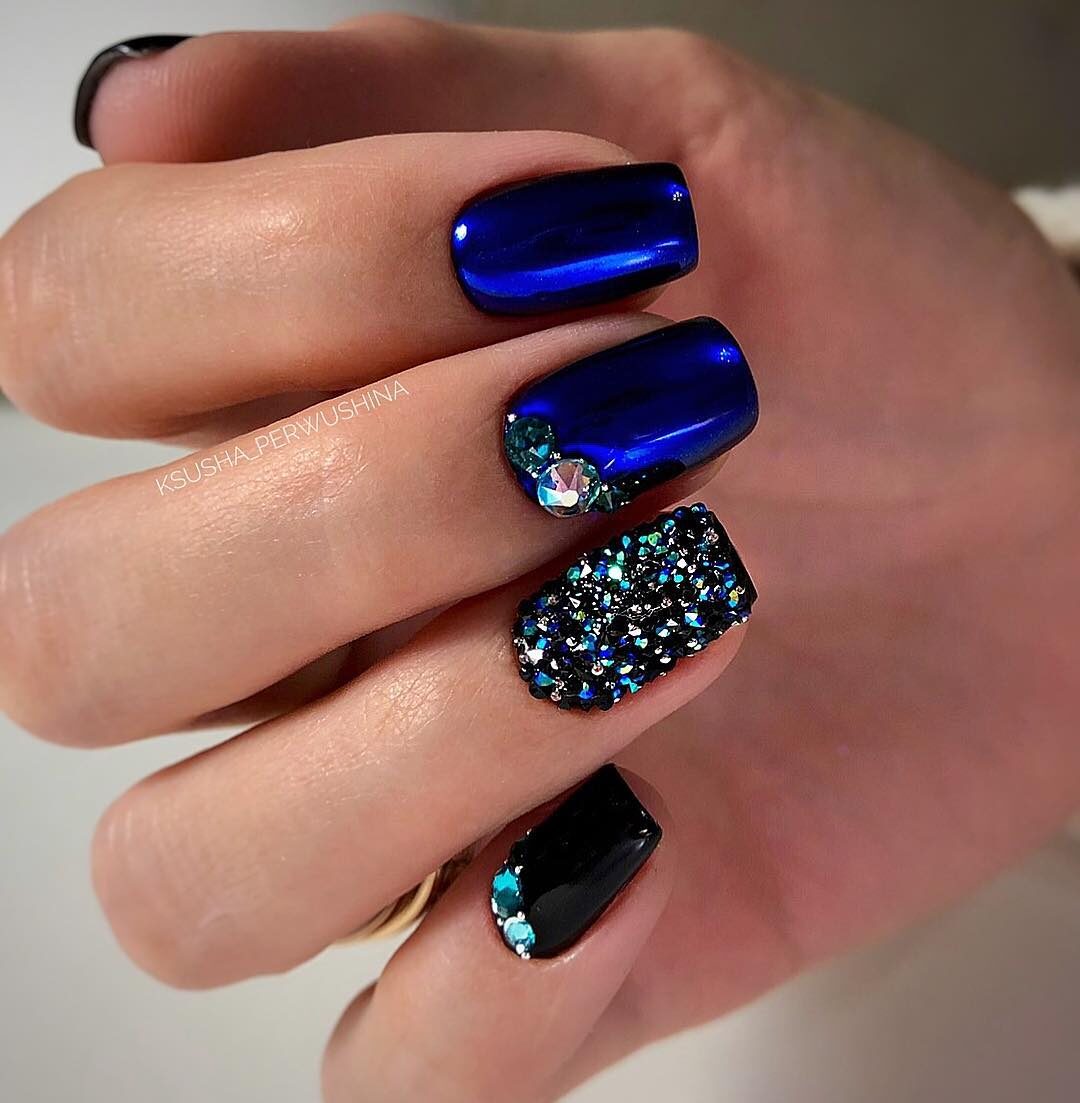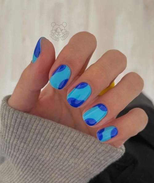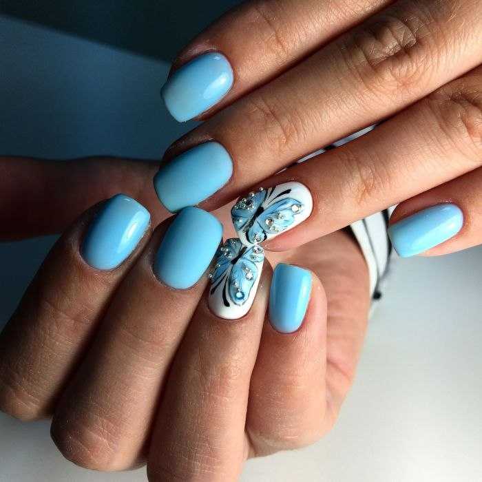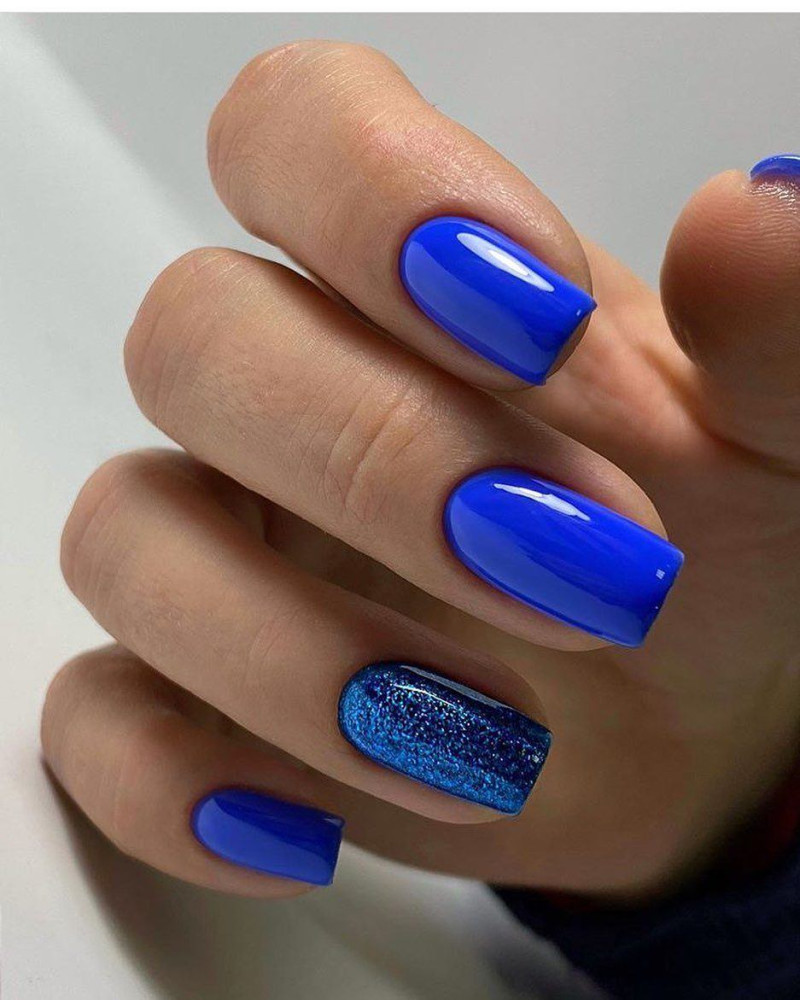 В ярко-синем цвете могут быть цветы, облака, френч, популярный эффект моря на ногтях или что-то необычное, оригинальное — что придумать сможет мастер или вы.