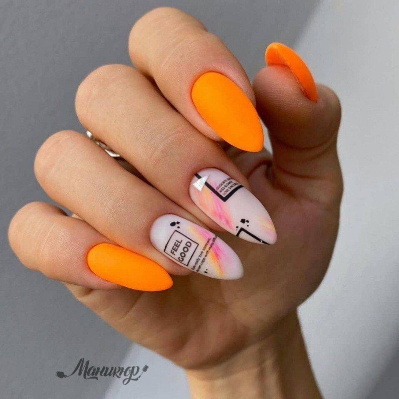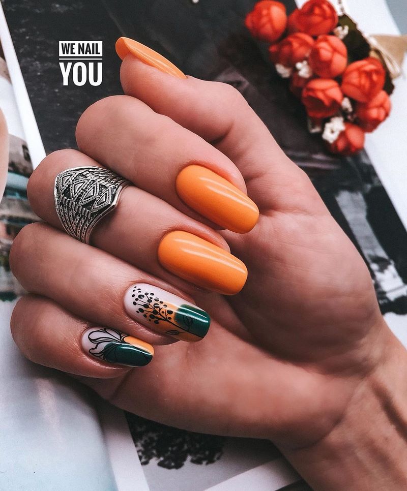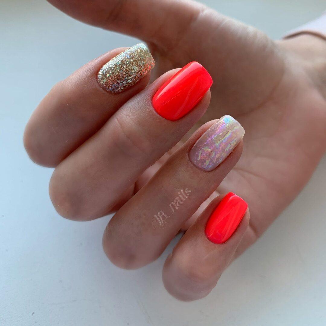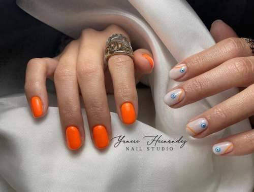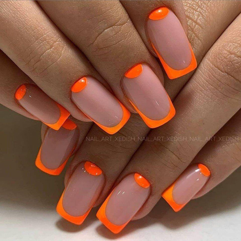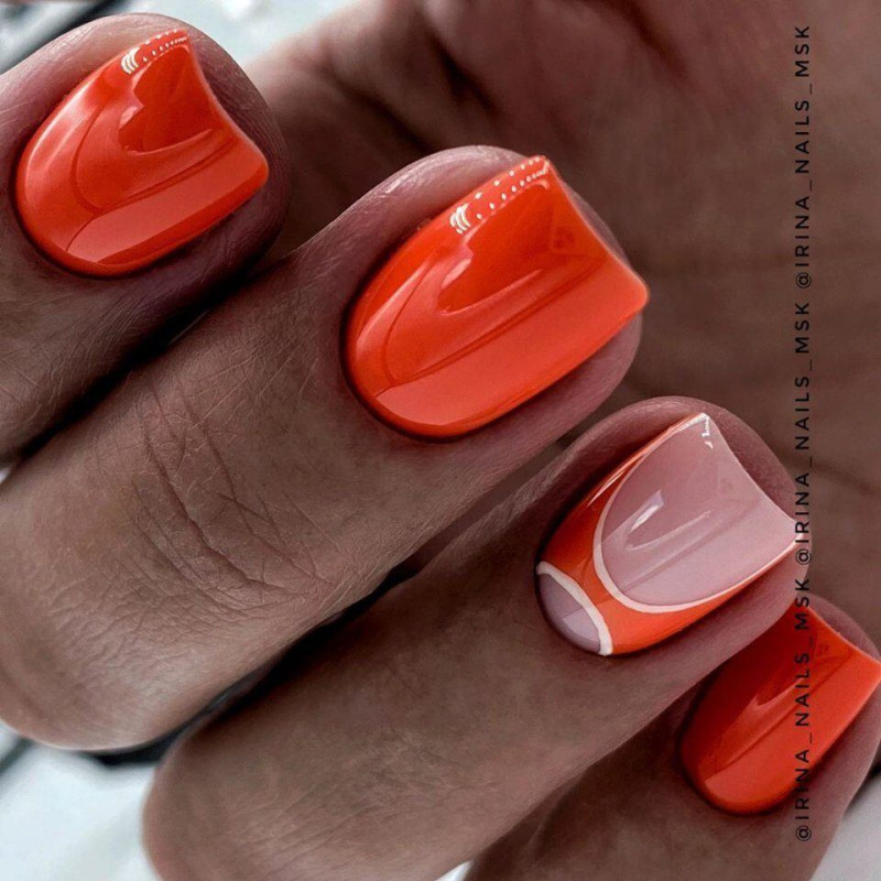 Яркий оранжевый удачно сочетается с золотистыми и серебристыми деталями — маникюр станет интереснее, а яркость палитры увеличится. Еще попробуйте к оранжевому добавить синий, желтый или зеленый цвет, чтобы увеличить его сияние. И актуальным вариантом будет френч.