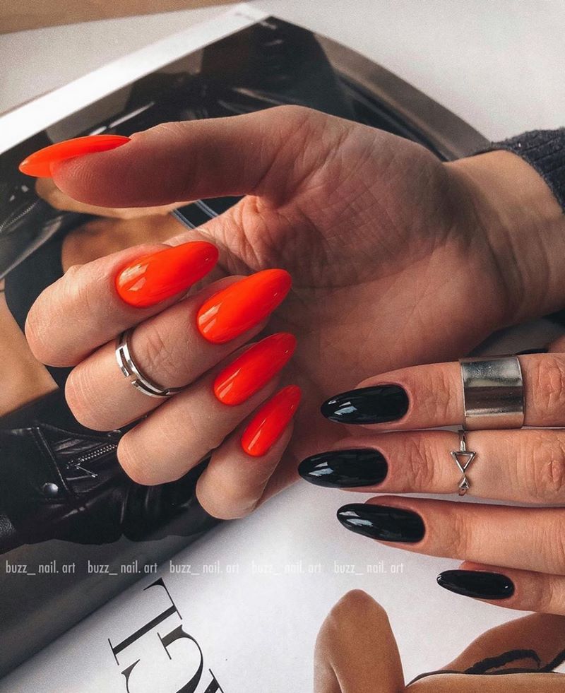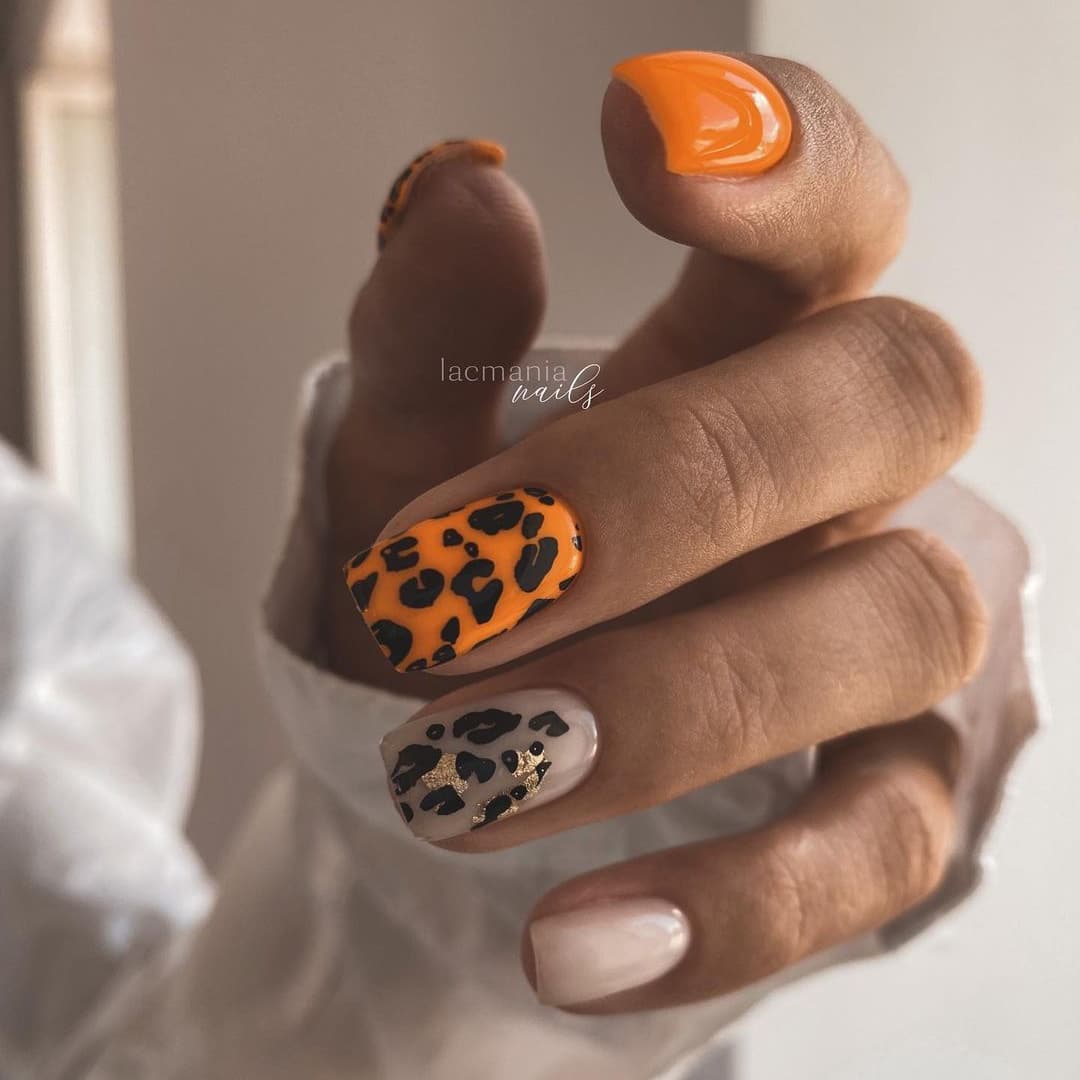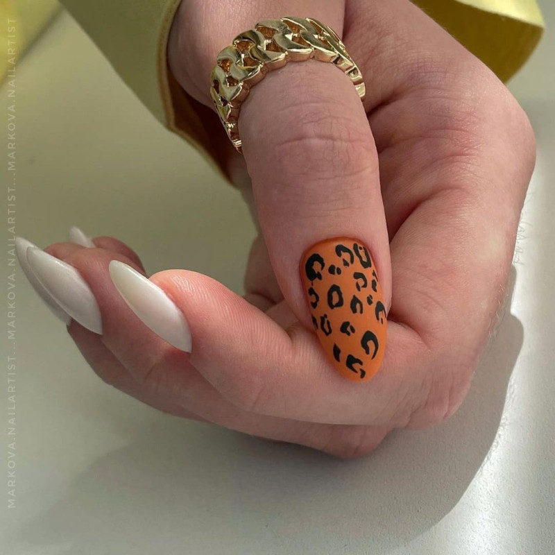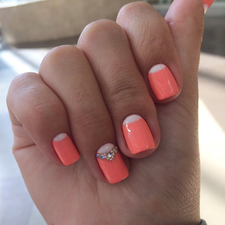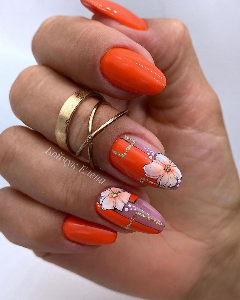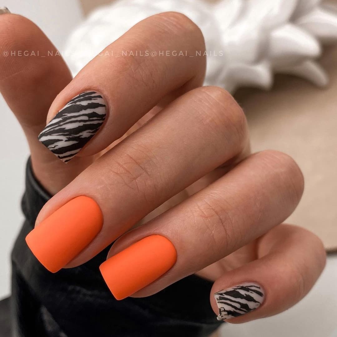 Яркий оранжевый удачно сочетается с золотистыми и серебристыми деталями — маникюр станет интереснее, а яркость палитры увеличится. Еще попробуйте к оранжевому добавить синий, желтый или зеленый цвет, чтобы увеличить его сияние. И актуальным вариантом будет френч.