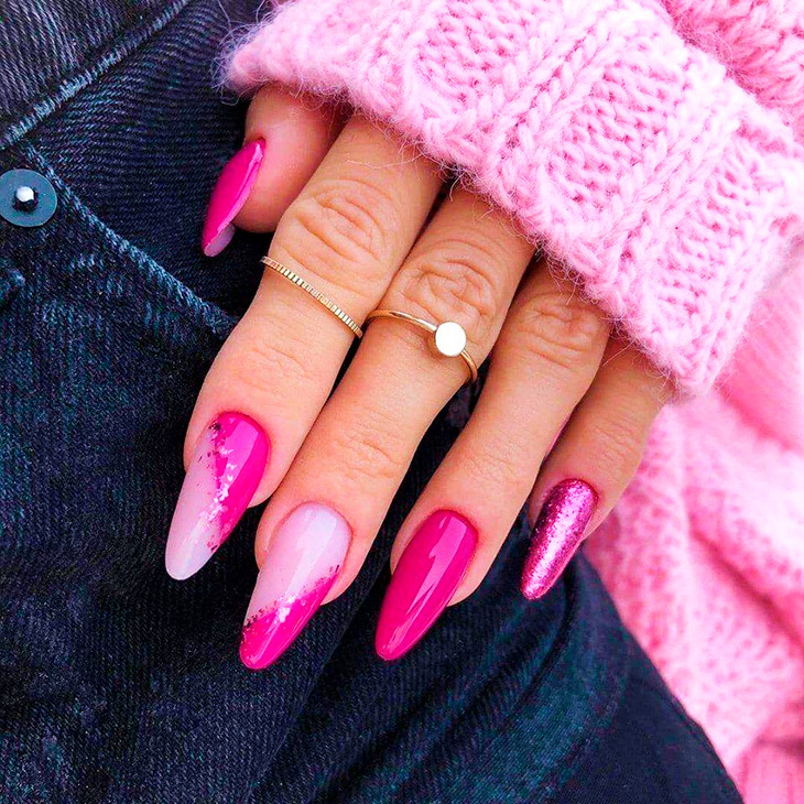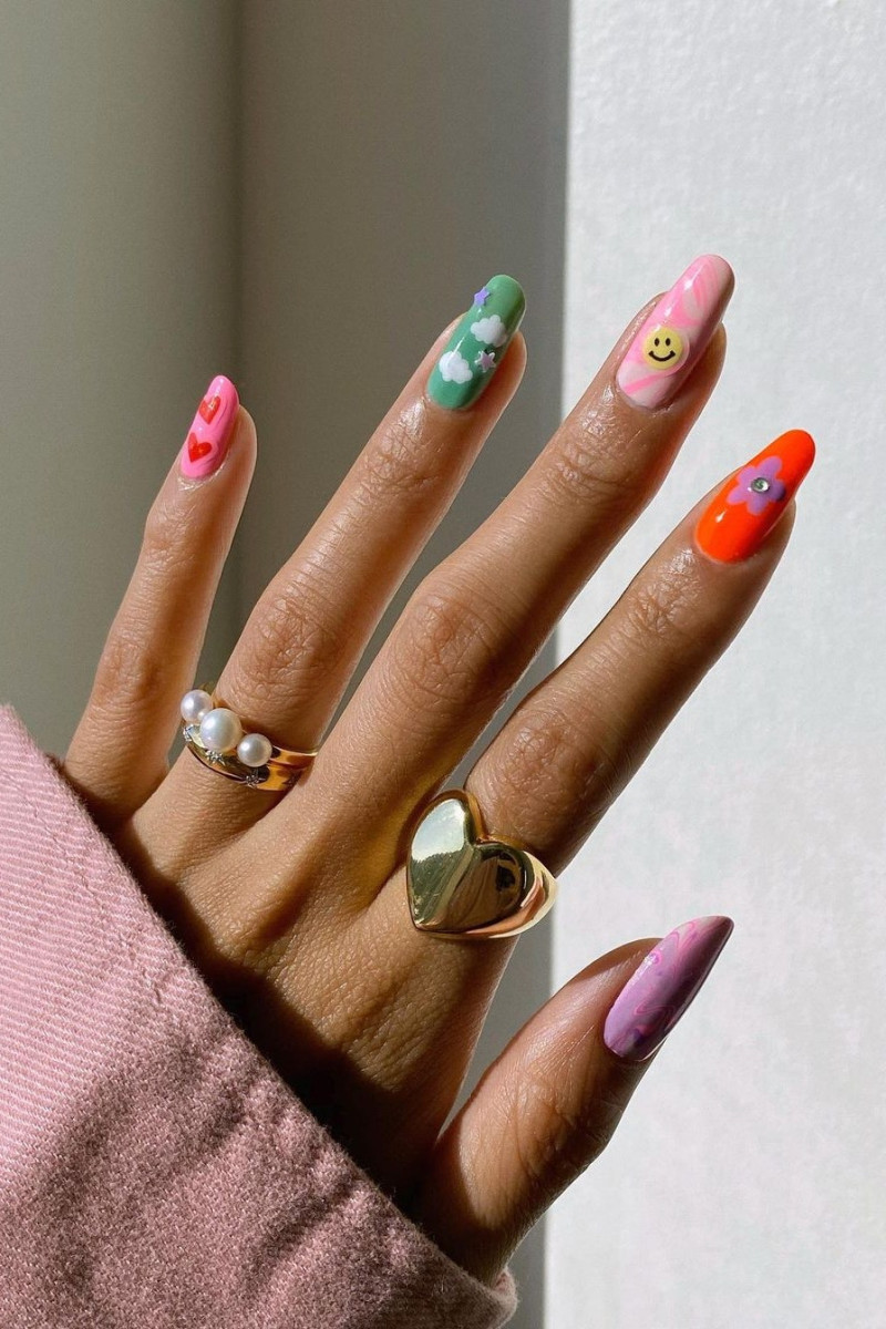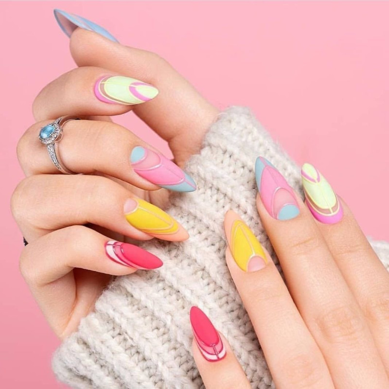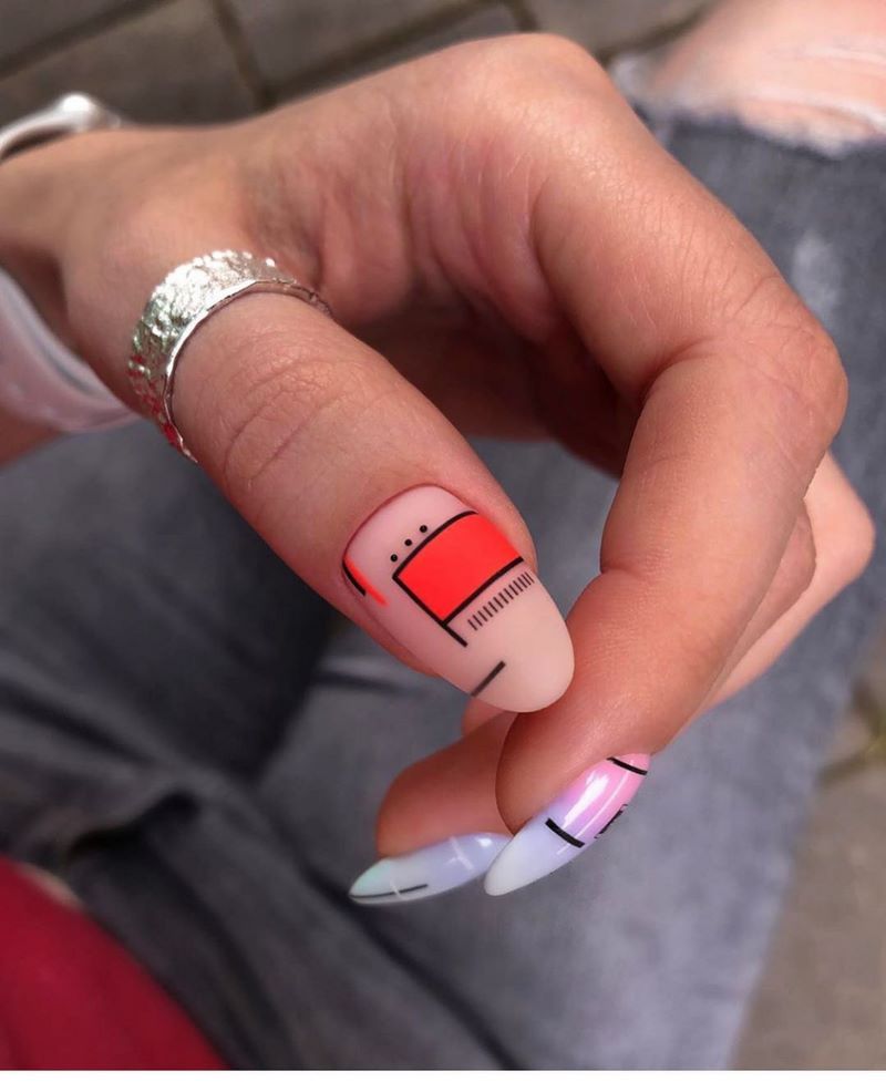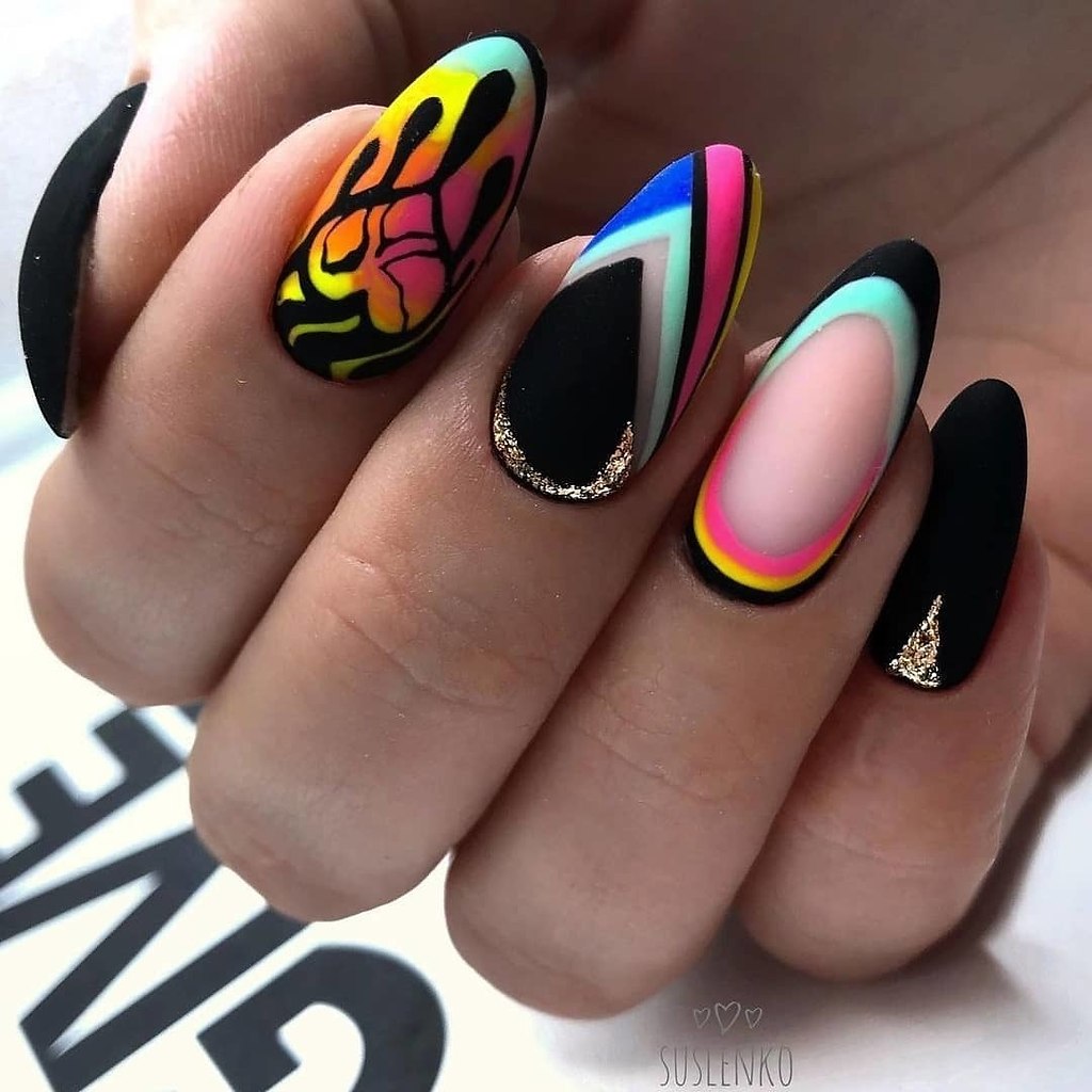 Для создания такого маникюра часто используют разные цвета на одном ногте. Просто добавьте узор или другой элемент. Примером могут служить французские ногти разных оттенков, покрытые разными лаками.