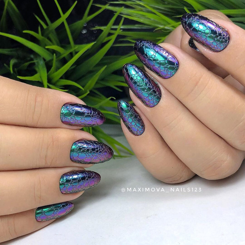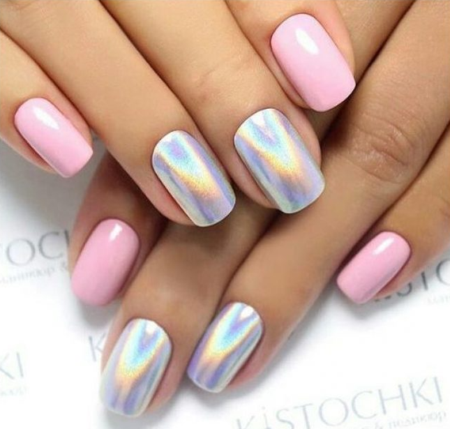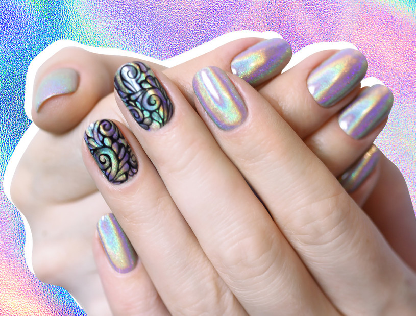 Голографический эффект возвращается в большом количестве, причем не только для больших ночных выходов и вечеринок, но и для работы и повседневного использования. Он появляется не только на всех ногтях, но и в качестве аксессуара на отдельных гибридных ногтях. Модные цвета в сочетании с отражающей поверхностью популярны среди минималистов, а также среди тех, кто любит акценты и может добавить наклейки и узоры к своему маникюру.