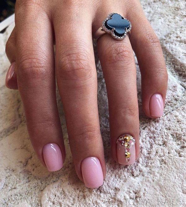 Сделать ноготки еще более привлекательными можно с помощью декорирования стразами или блестками. Главное не перестараться, достаточно 1-3 элементов на ноготь.