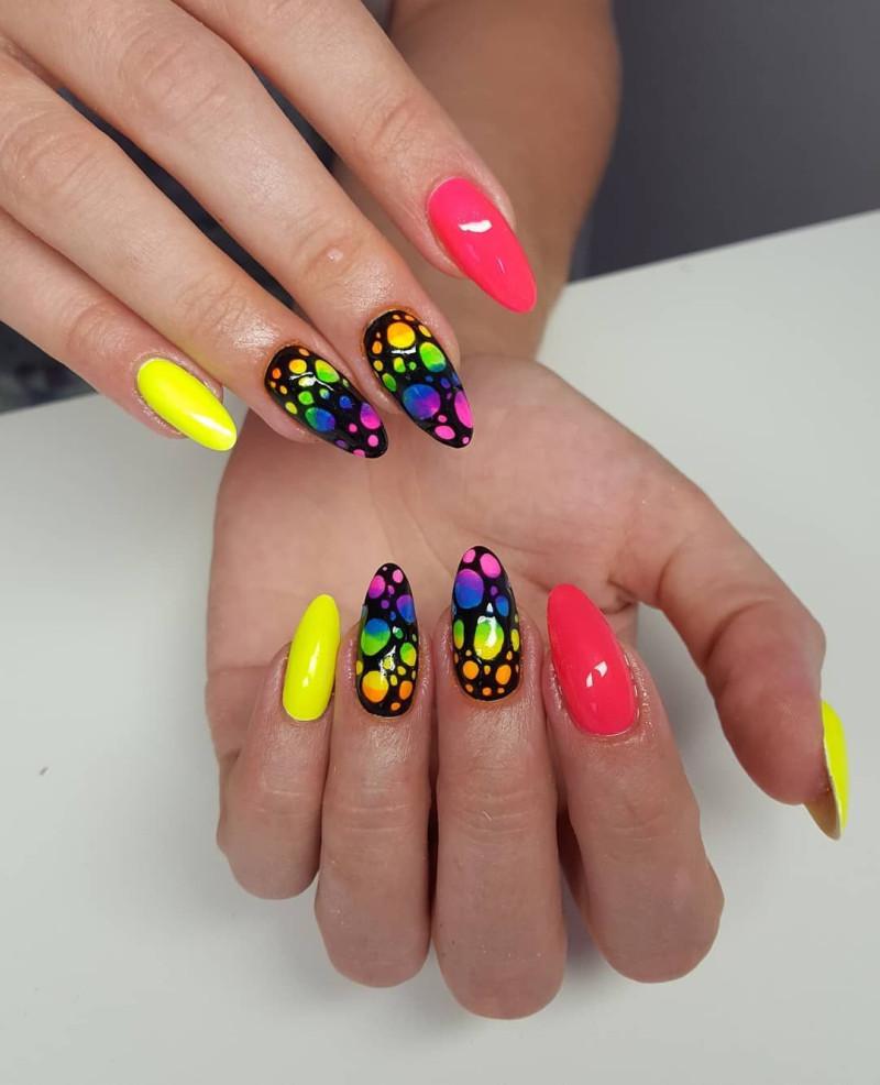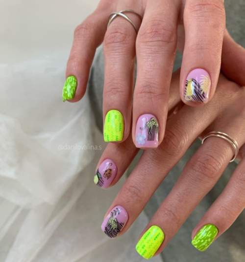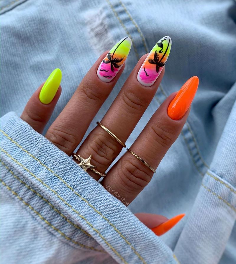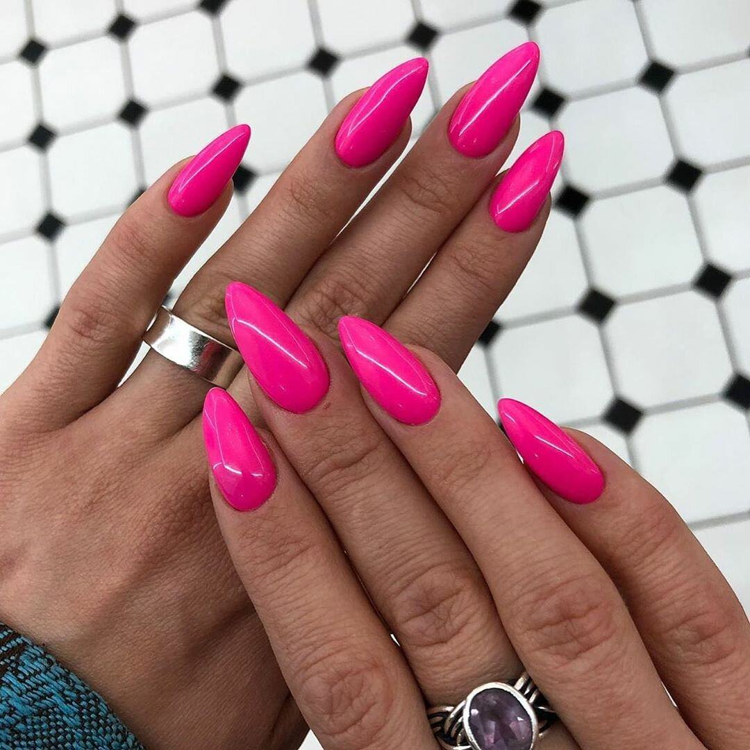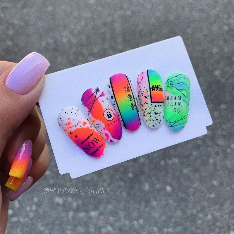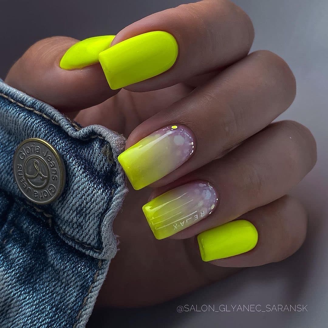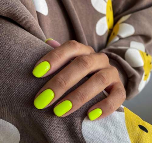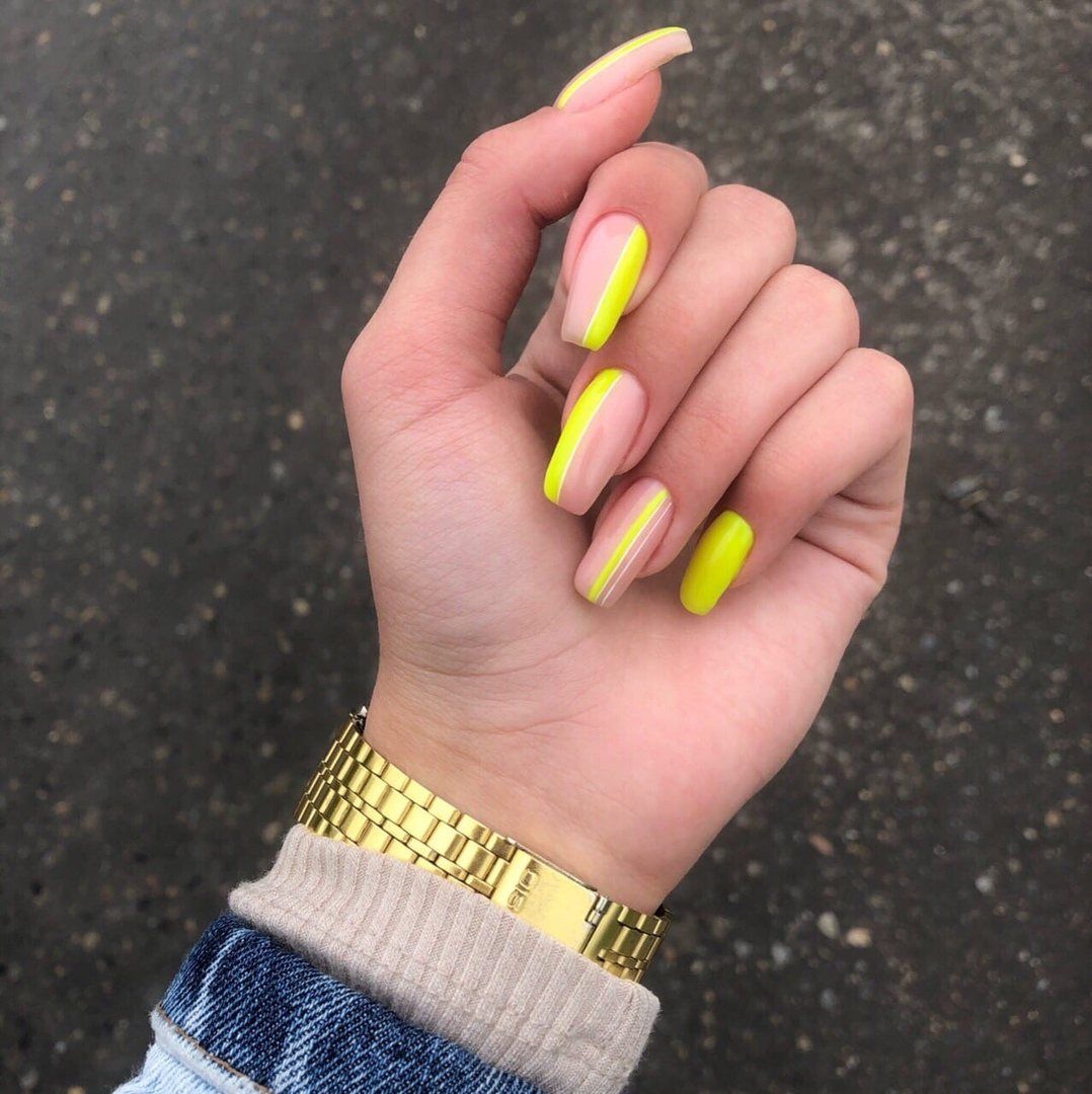 Наравне с яркими оттенками для ногтей в этом году популярен неоновый маникюр. Если хотите ярко и стильно, не нужно добавлять в дизайн лишних деталей. Кислотные оттенки и так достаточно красочные, интересные цвета для создания однотонного маникюра или ярких рисунков на нейтральных покрытиях. Выбор — ваш.