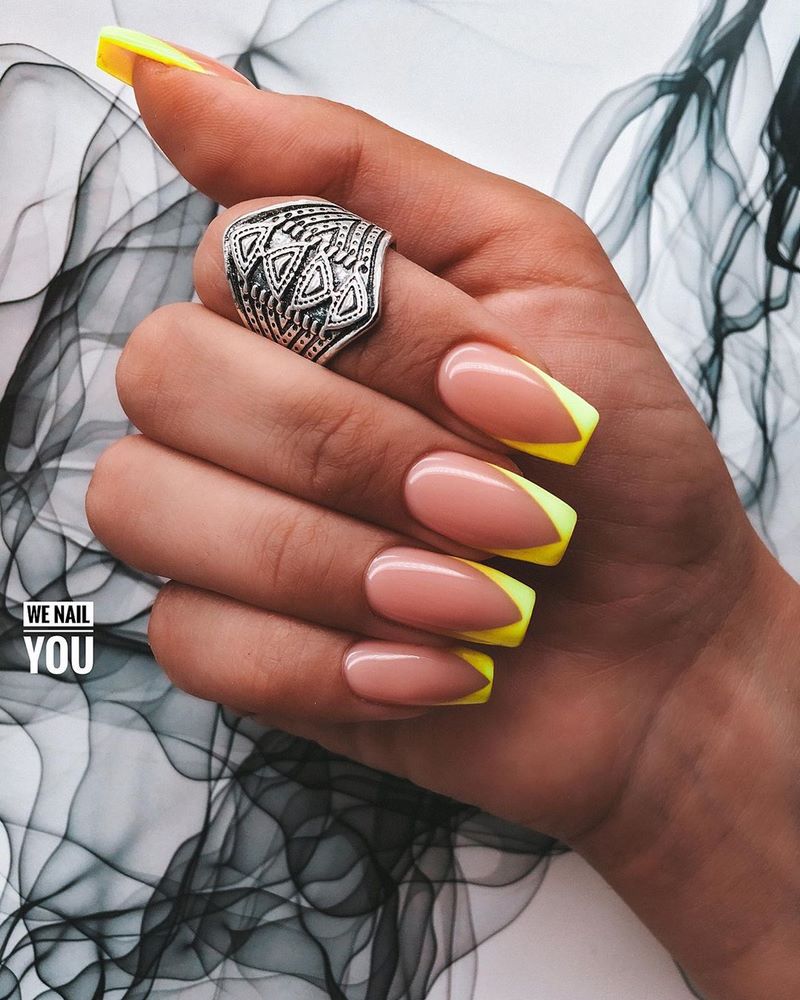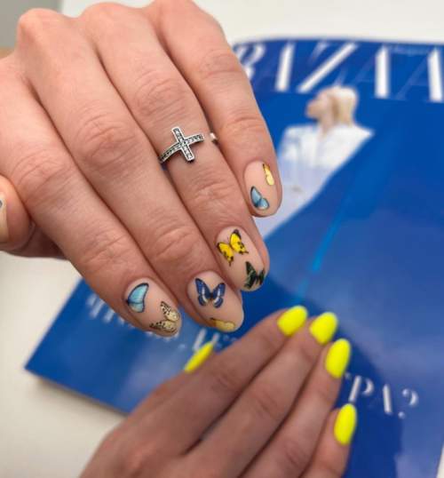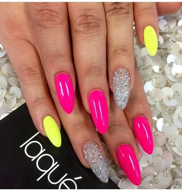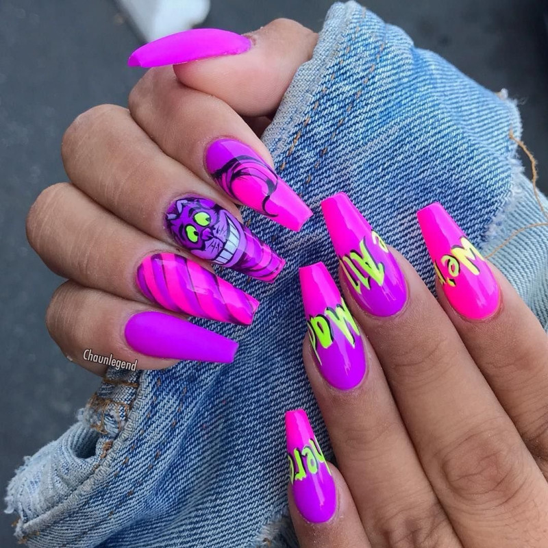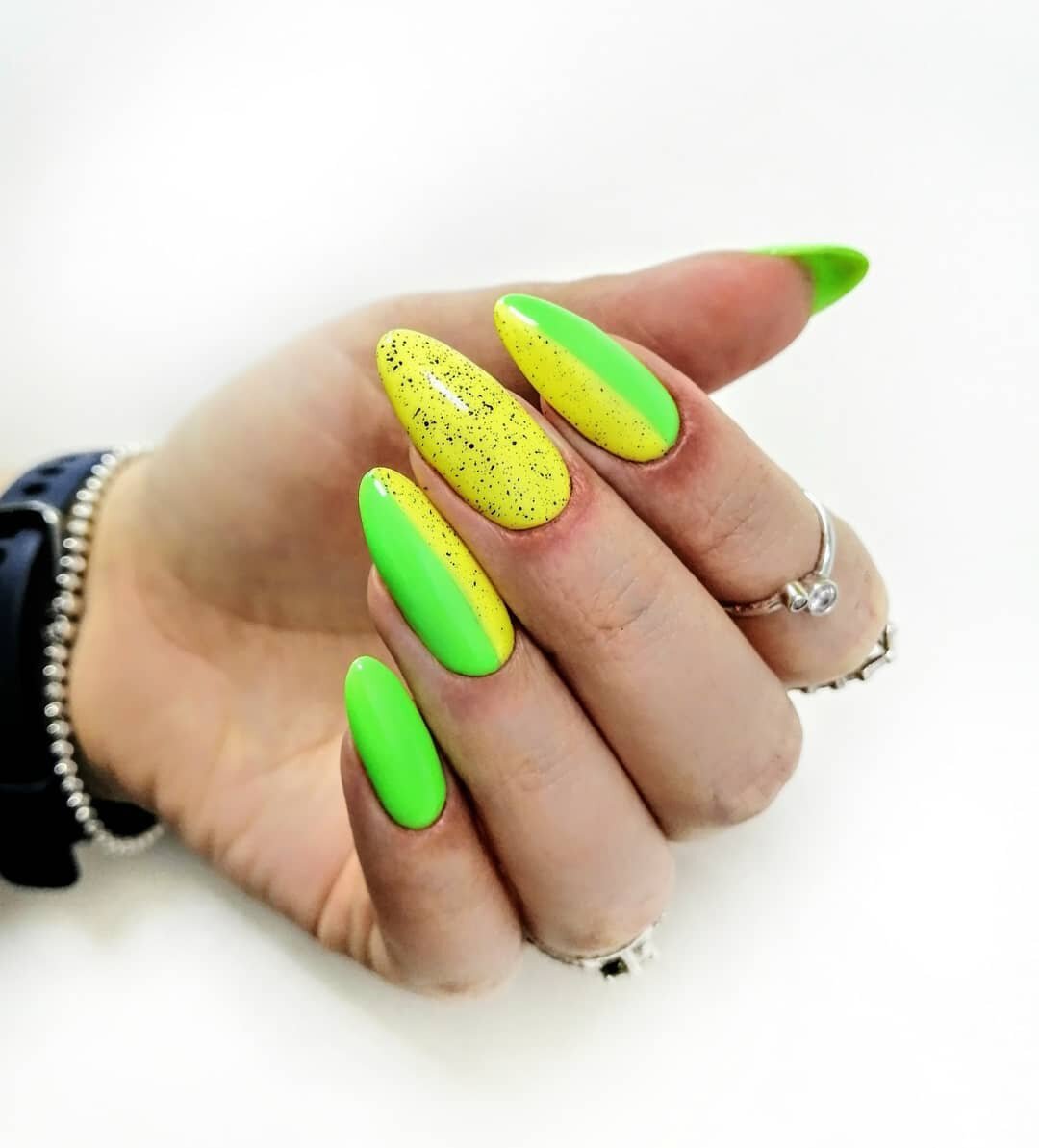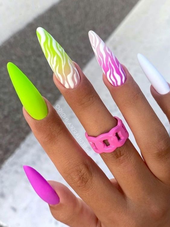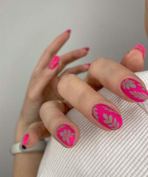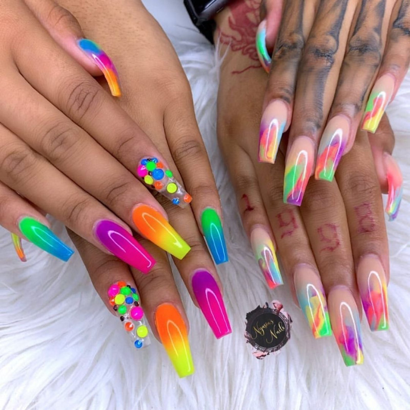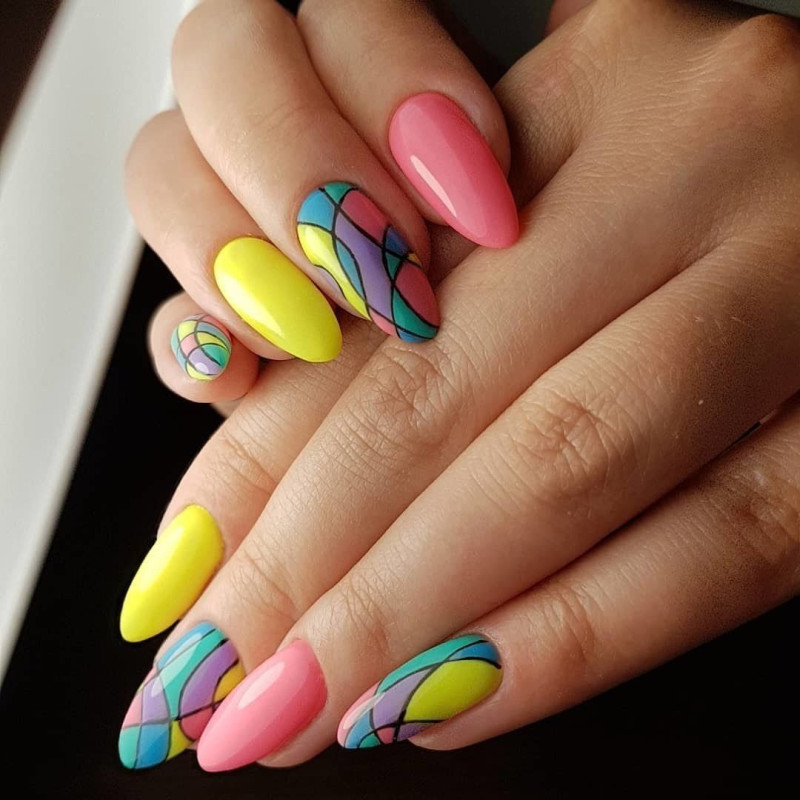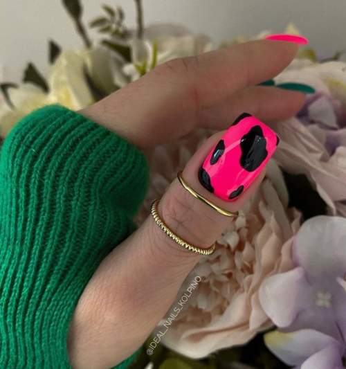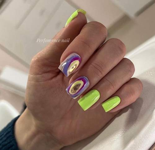 Наравне с яркими оттенками для ногтей в этом году популярен неоновый маникюр. Если хотите ярко и стильно, не нужно добавлять в дизайн лишних деталей. Кислотные оттенки и так достаточно красочные, интересные цвета для создания однотонного маникюра или ярких рисунков на нейтральных покрытиях. Выбор — ваш.