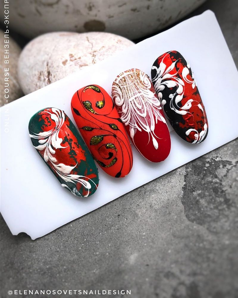 Сочетание красок безгранично. Лишь бы они задавали праздность в духе бразильского или венецианского карнавала. Приветствуются стразы. Заполнение сюжетом может быть ограниченным – на одном безымянном или двух пальцах, – или полным, т.е. на всех пяти.