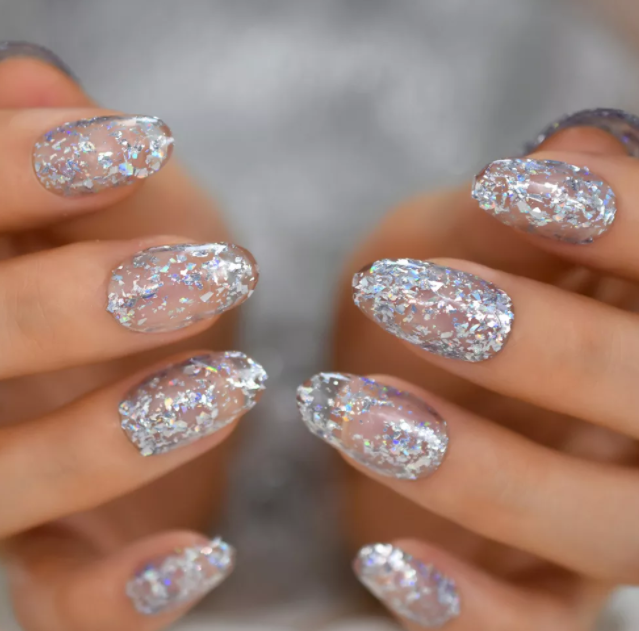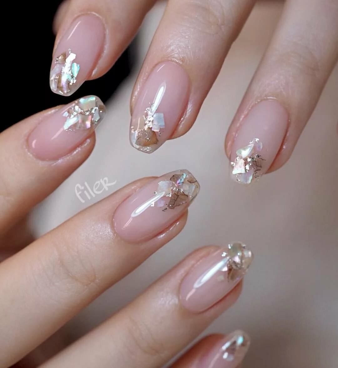 Лучшим вариантом будет использование в дизайне серебристого, не слишком блестящего, или розоватого нейл-глиттера.
