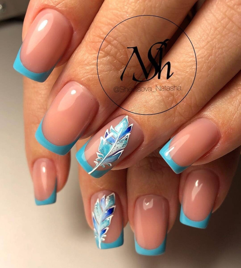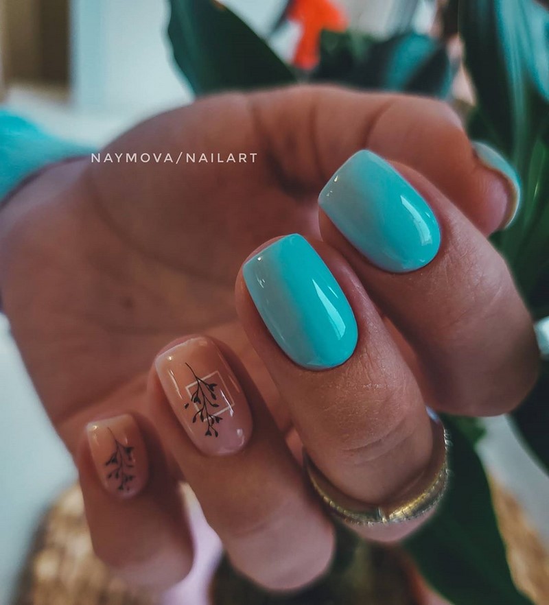Еще один яркий цвет для модного летнего маникюра. Кроме того, именно бирюзовый цвет зачастую задает настроение дизайна ногтей в отпуск и подчеркивает загар. К примеру, сделайте стильный дизайн бело-лазурный френч или маникюр с яркими волнистыми линиями.