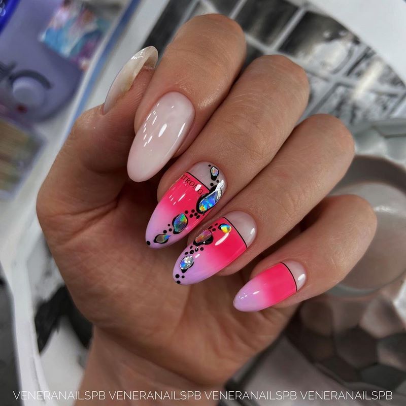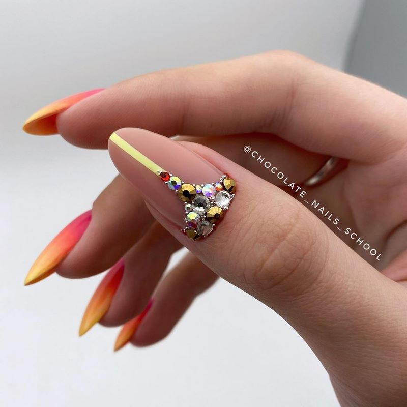 Но сейчас речь идет о другом тренде. У зарубежных мастеров и блогеров такой летний маникюр получил название Geode Nails. Оно пошло от названия осадочной породы, которое на русском звучит как жеода. Особенность такой породы в том, что ее сердцевина плотно наполнена яркими кристаллами, которые словно растут на стенках.