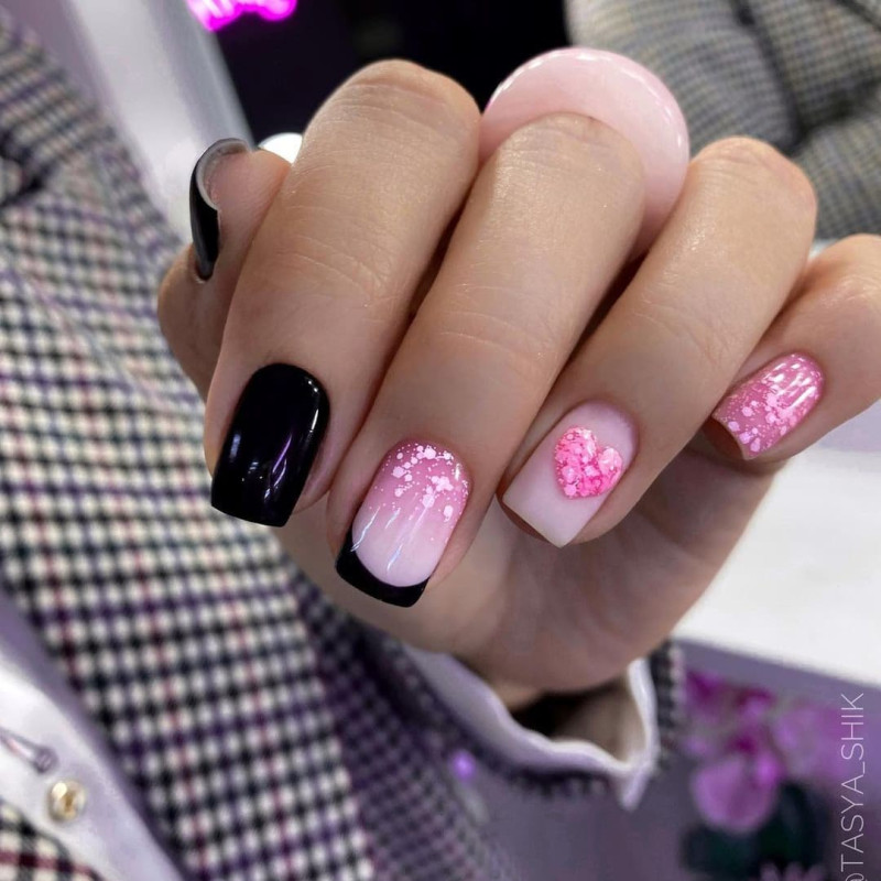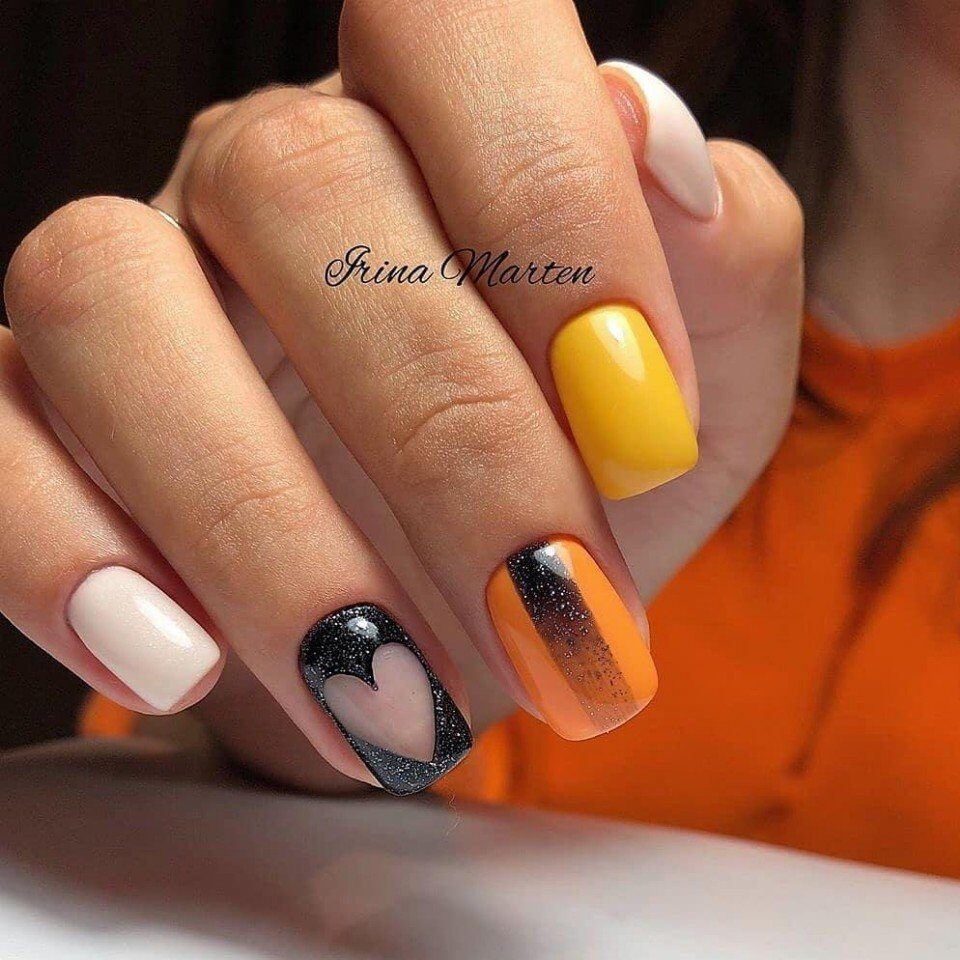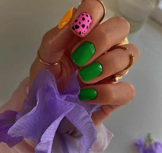 Чтобы маникюр выглядел стильно и гармонично, можно использовать только два цвета. Как правило, для создания акцента на сердце и среднем пальце выбирают контрастный оттенок. Два цвета могут быть похожими или дополнять друг друга.