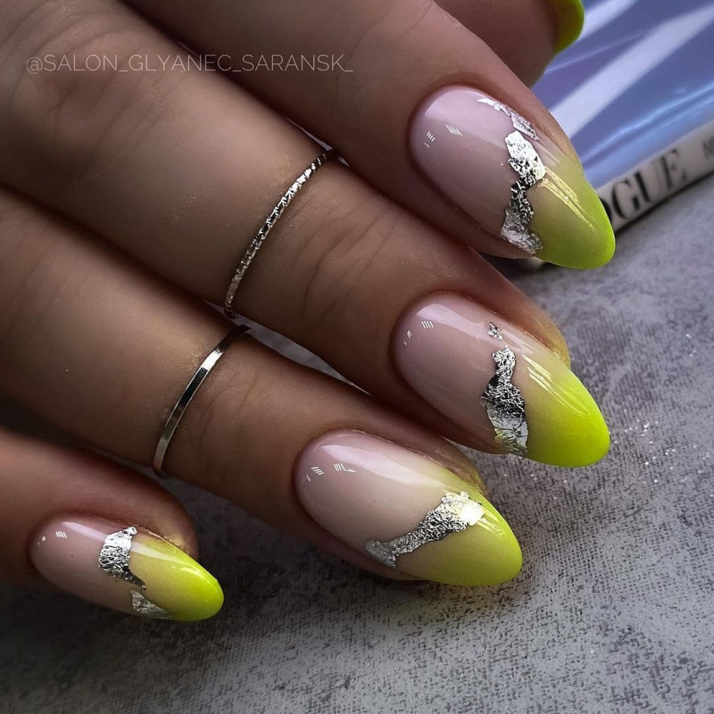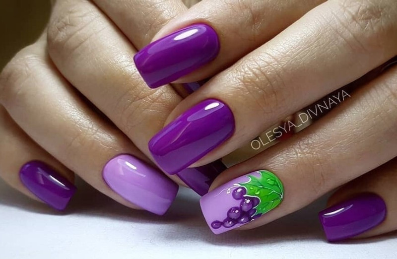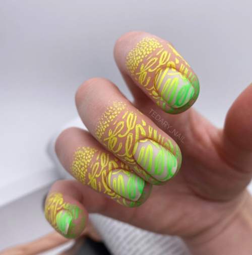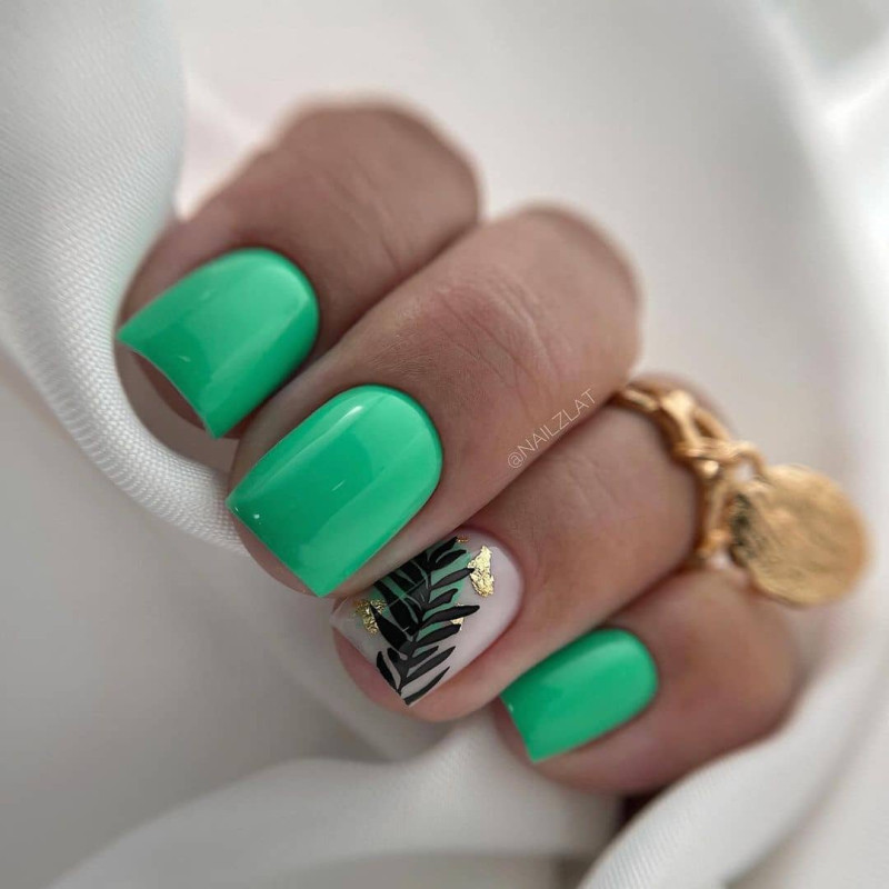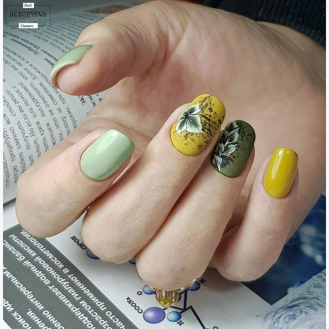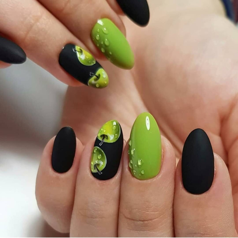 Лимонно-зеленый и салатовый не теряют актуальности уже второй сезон. Если еще не успели сделать такой модный маникюр, самое время исправить эту ошибку. Например, яркий зеленый отлично подходит для граффити, стемпинга — смотрите фото 2. А в матовом исполнении без лишних деталей позволит избежать излишней яркости.