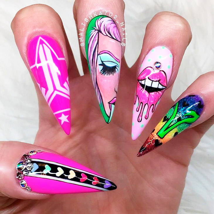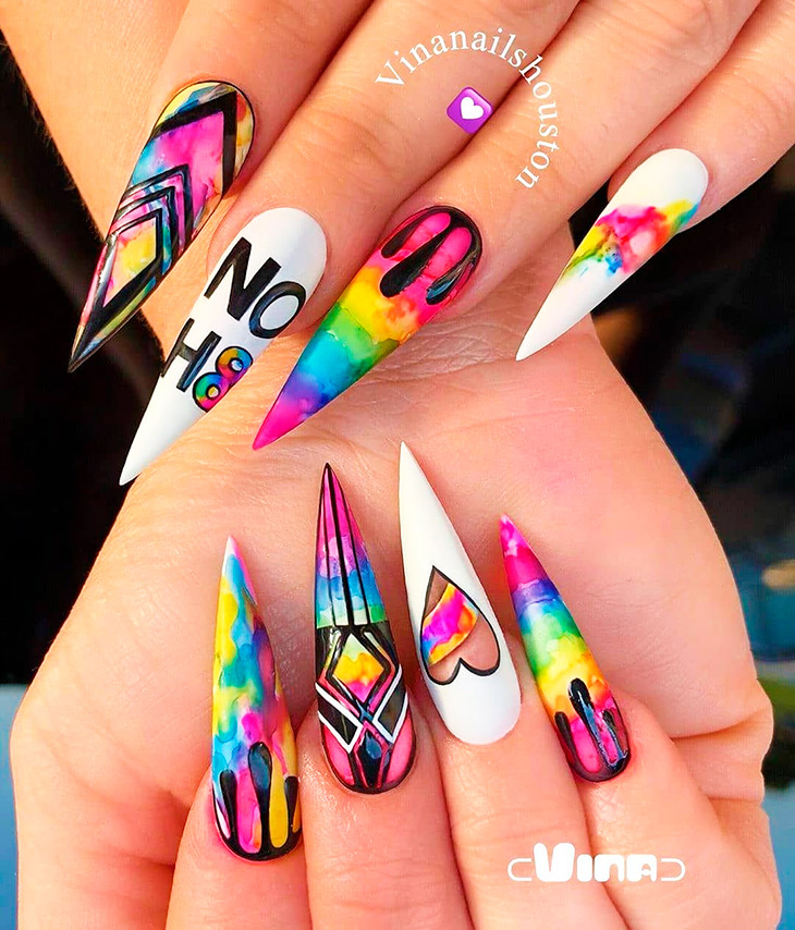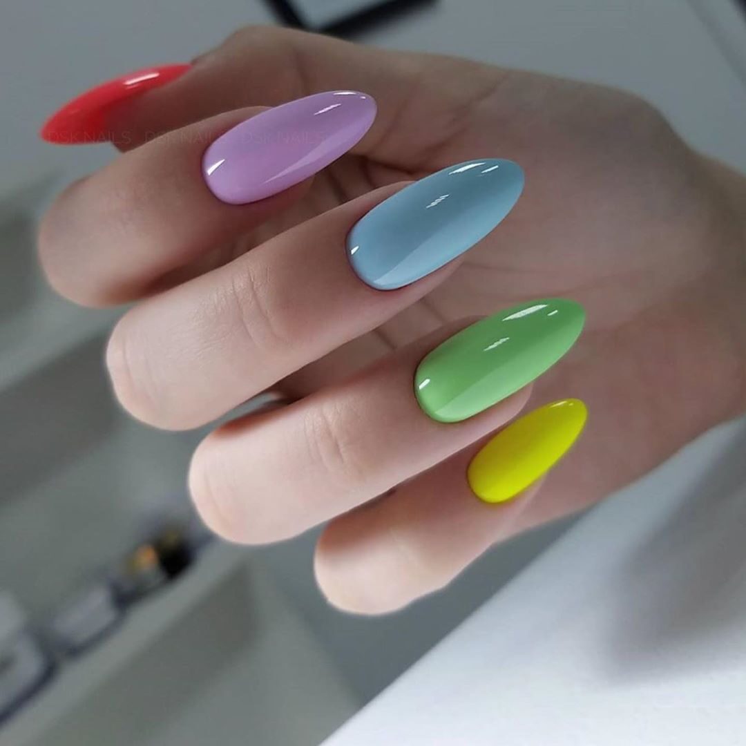 Разноцветный и яркий маникюр с дизайном на длинных ногтях притягивает к себе взгляды. Отличный сногсшибательный вариант для лета, отдыха и вечеринок. Он предполагает окрашивание каждого ногтя в другой цвет. Но чтобы образ смотрелся гармонично, необходимо правильно подбирать цветовую гамму лака.