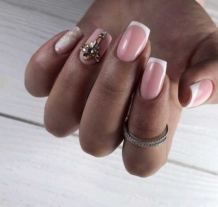 Французский маникюр в светлых оттенках – это классическое исполнение подобного дизайна, которое предусматривает выделение кончика ногтевой пластины улыбкой белого цвета на розовом, бежевом или прозрачном основании. Среди актуальных новинок этого новомодного сезона светлый френч, дополненный изысканными рисунками на акцентных пальчиках или по линии улыбки. Кроме того сама улыбка может быть выполнена оригинальным ажурным рисунком, подчёркиваться глиттером или иметь необычную форму. Френч шикарно смотрится в дуэте со стразами, жемчугом, элементами фольги и другим подобным декором.