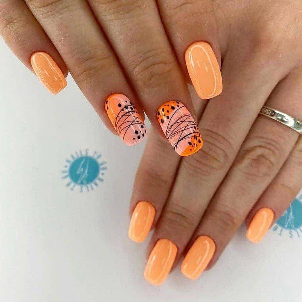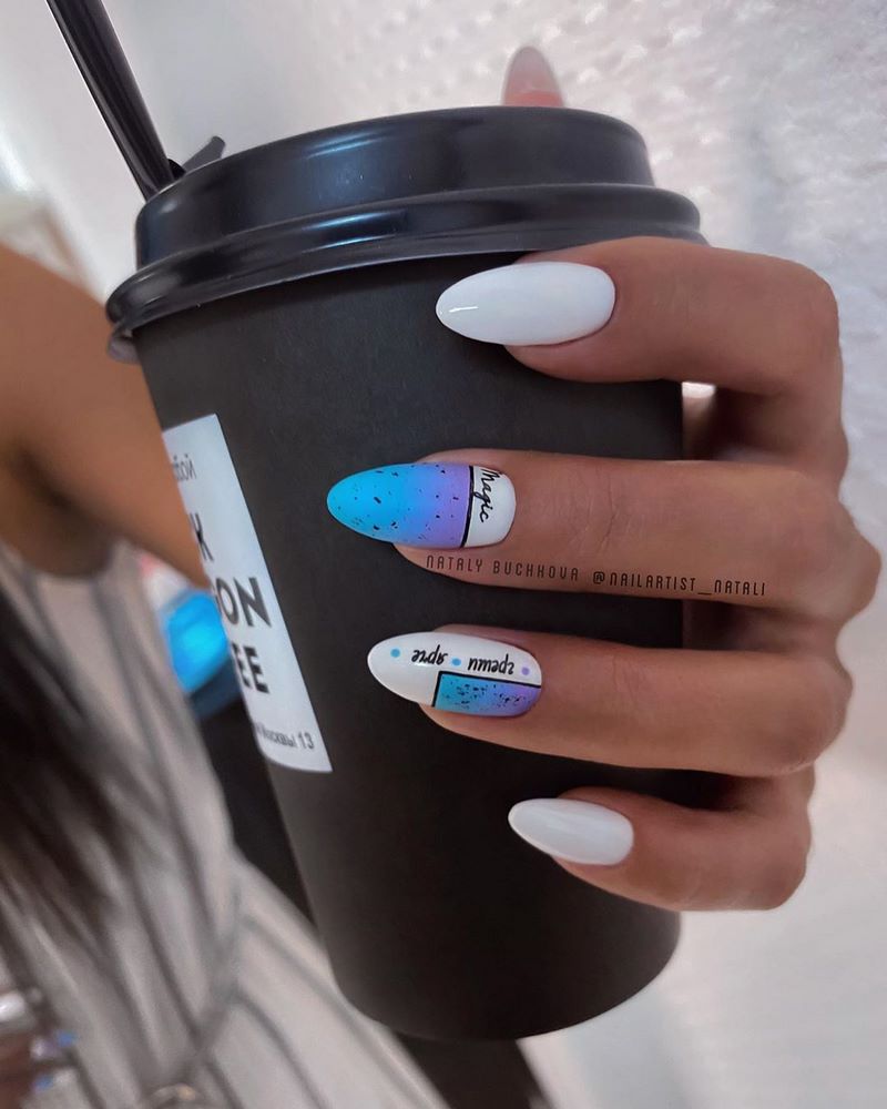 Акцентная половинка. Просто разделите ноготь на две части (или больше) и брызгами оформите отдельные зоны; сдержанные брызги. Мазки или капельки краски в летнем маникюре могут быть очень яркими или, наоборот, практически незаметными. Такой акцент на нежной базе подойдет сдержанным дамам или тем, у кого установлены жесткие требования на рабочем месте. Если выбираете декор мазки, можете просто сделать акцент посередине ногтя. Лучше вертикальный, он визуально сделает пластину длиннее и изящнее; градиентные брызги. Да, есть и такие. Просто сделайте их более кучно у лунки и уменьшайте количество ближе к кончику ногтя. Для летнего маникюра подойдут любые яркие оттенки лака