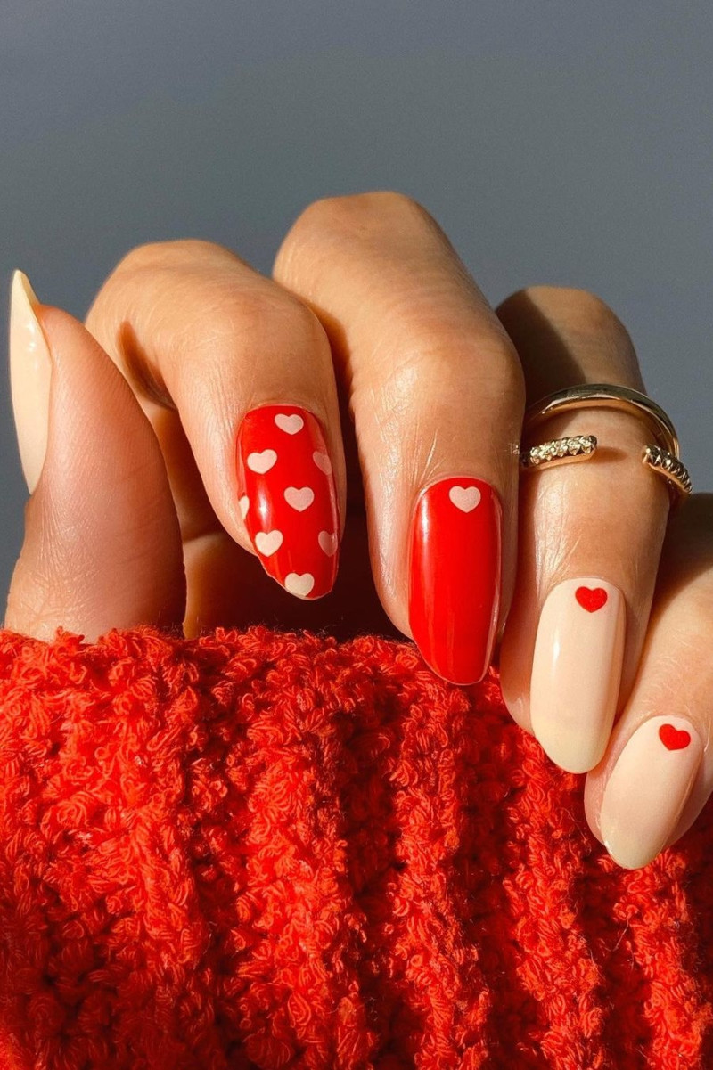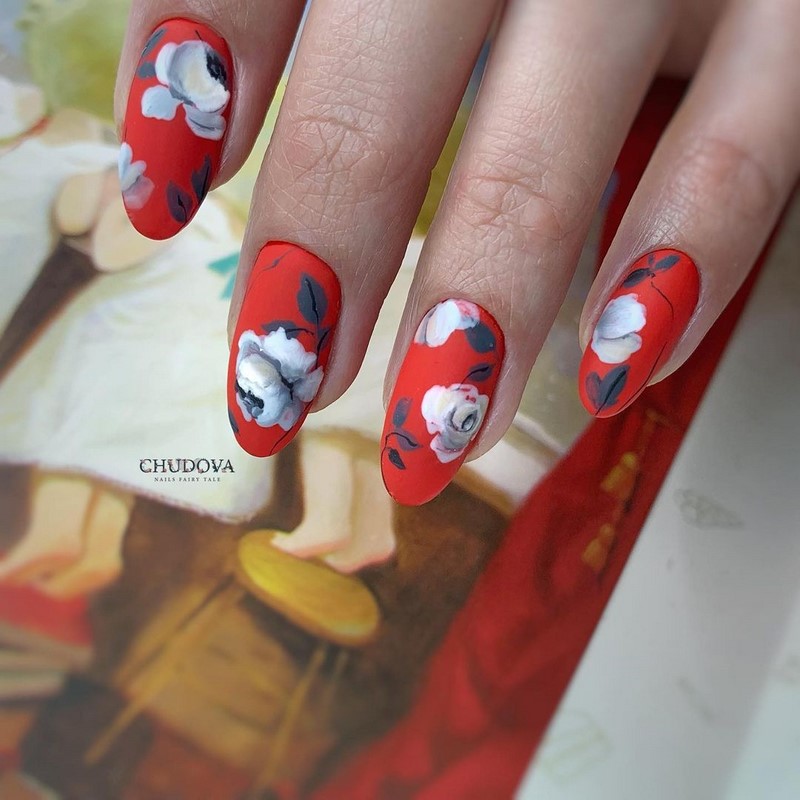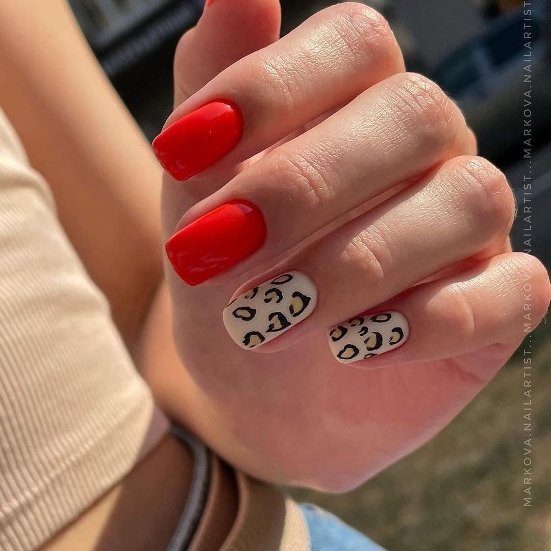 Бело-красная композиция считается классической. При правильном распределении контрастов такой маникюр становится деловым, повседневным или праздничным.