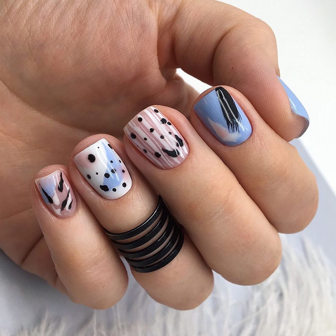 Нейл мастера в новых сезонах предлагаю принципиально новый взгляд на обычные дизайны ногтей, используя такую технику, как «мазки кистью художника» или же «случайные брызги» и, конечно, геометрические изображения и рисунки. Какой бы ни был выбран вариант – главное, чтобы цвета сочетались и были гармоничными друг с другом. В противном случае получится весьма неудачный вариант – вычурный и пошлый. А это совсем не нужно модницам и светским дамам.
