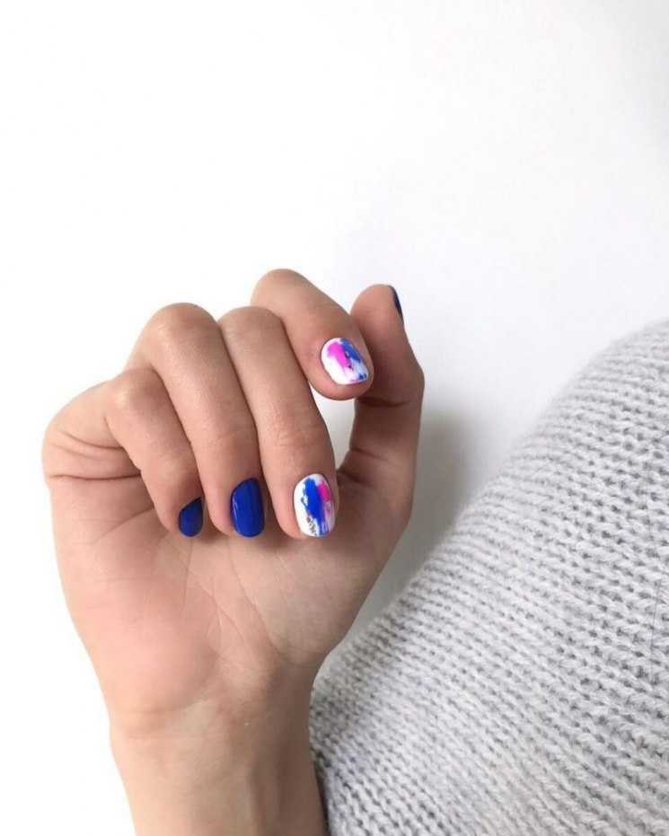 Только убедитесь, что ваши лаки для ногтей имеют одинаковое “направление”, то есть не сочетайте бледные, пастельные оттенки с яркими. Например, светло-голубой и бледно-розовый или наоборот. Выберите два пастельных оттенка или два ярких. Вы также можете разнообразить свой маникюр интересным узором, полосками или камнями, создав акцент на одном или двух ногтях.