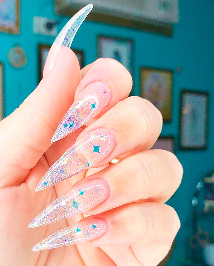Все чаще можно увидеть именно прозрачный длинный маникюр на женских руках, и это совсем не бесцветное покрытие. Это довольно необычный, интересный, эффектный и вместе с тем натуральный маникюр.