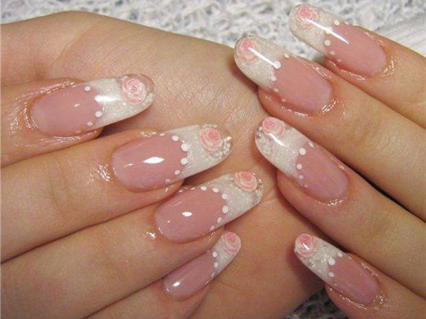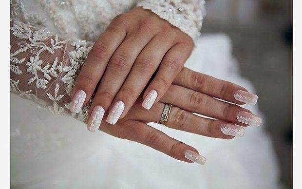 Французский маникюр с кружевом выглядит очень нежно и романтично. Такой вариант подойдет как для романтического свидания, так и для свадебного образа.