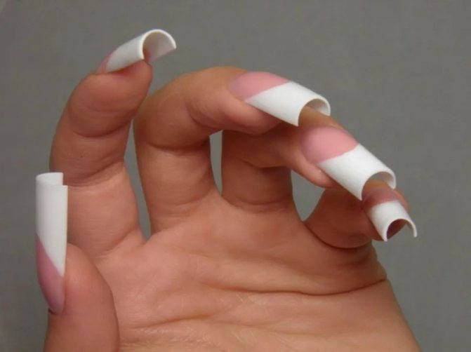 При наличии поврежденной поверхности пластин, а также недостаточной длины, обычно используются типсы — готовые искусственные кончики.