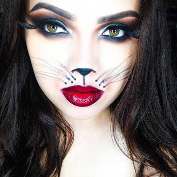 Используйте для создания макияжа черную подводку и тени для глаз. Нарисуйте с их помощью усы и носик кошки. Наклейте накладные длинные ресницы. Накрасьте губы яркой помадой. Шикарный мейкап на Хэллоуин готов!