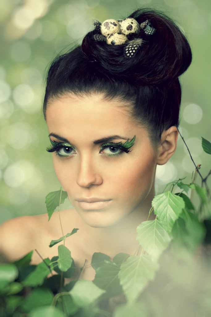 Пришло время самого интересного! Пора заняться ресницами, которые будут весьма необычны, ведь это фантазийный макияж. Сперва на ресницы наносится тушь темно-зеленого цвета одним слоем. В уголок глаза приклеивается пучок накладных ресниц, но не обычных, а с перьями подходящего тона. Например, они могут быть розовыми, что удачно впишется в желто-зеленую гамму.