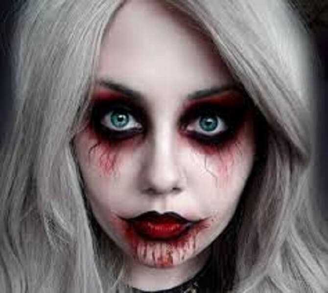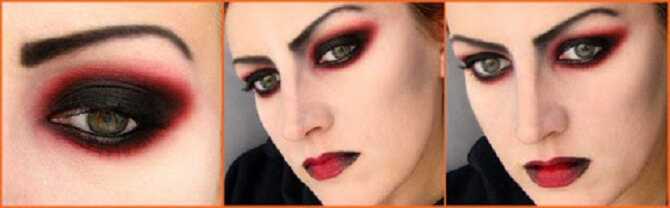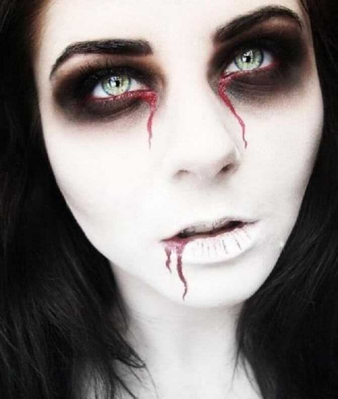 Можно подчеркнуть вид крови с помощью красных теней и нанести помаду такого же цвета.