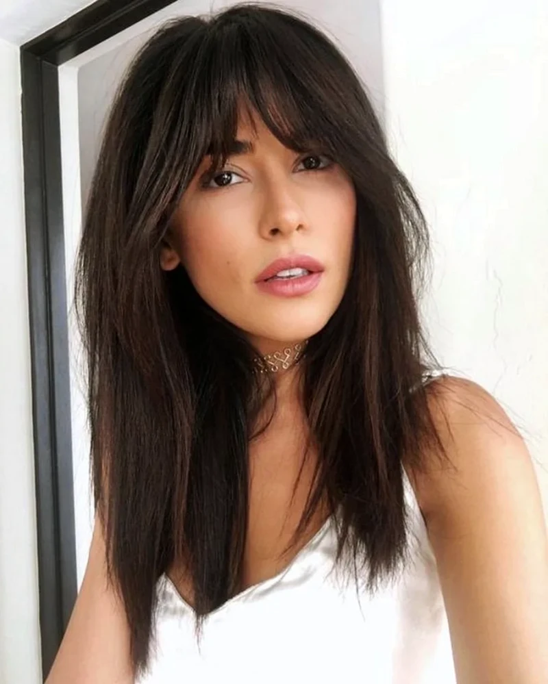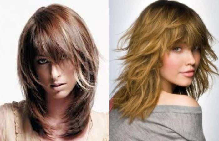 Скошенная прядь гармонирует с волосами средней длины. Это может быть легкий каскад, удлиненное каре, модный боб, стильная аврора или обычная лесенка. Вот популярные решения: