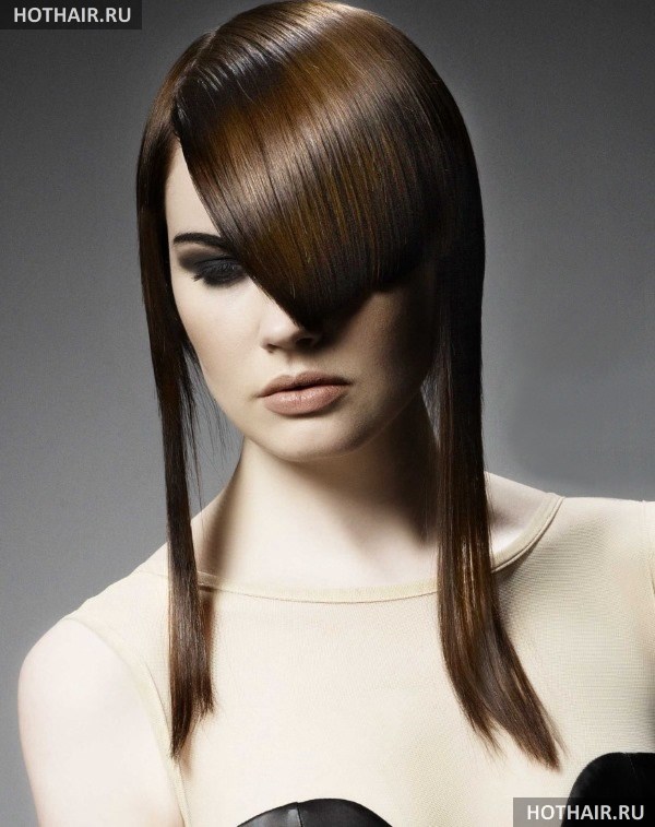 Выпрямление. Удлиненная асимметричная челка после утюжка приобретает строгие геометрические формы, хорошо заметен ее срез и наличие градуировки. Данная укладка отлично смотрится и с аналогичными стрижками (каре, боб, лесенка), и в контрастных сочетаниях. Выпрямленная косая челка и волнистые локоны придадут образу легкости и романтичности, помогут замаскировать недостатки и диспропорциональность лица.