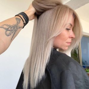 После вытягивания важно тщательно зафиксировать прядь, особенно если волосы склонны виться. Можно дополнительно подчеркнуть структуру асимметричной челки с помощью мусса или пенки.