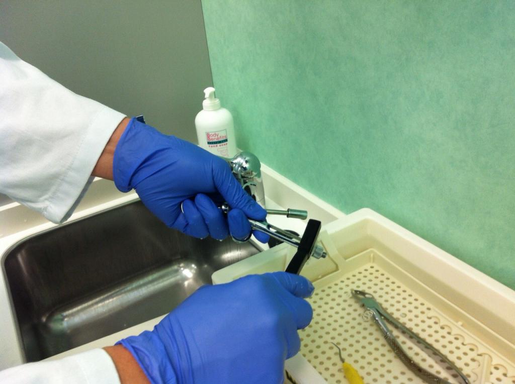 - Далее необходимо провести тест на скрытую кровь, протерев рабочую поверхность инструмента реагентом. Если реакция не произошла, то следует прополоскать инструмент и перейти к следующему шагу. Если реагент изменил цвет, то необходимо вернуться к шагу 1.