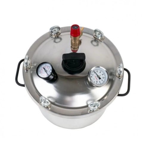 Автоклав для консервирования из нержавеющей стали оснащен биметаллическим термометром и аварийным клапаном в запорной крышке. Рассчитан на 26 л продуктов, позволяет заготавливать дома птицу, рыбу и грибы, делать сладости на зиму.