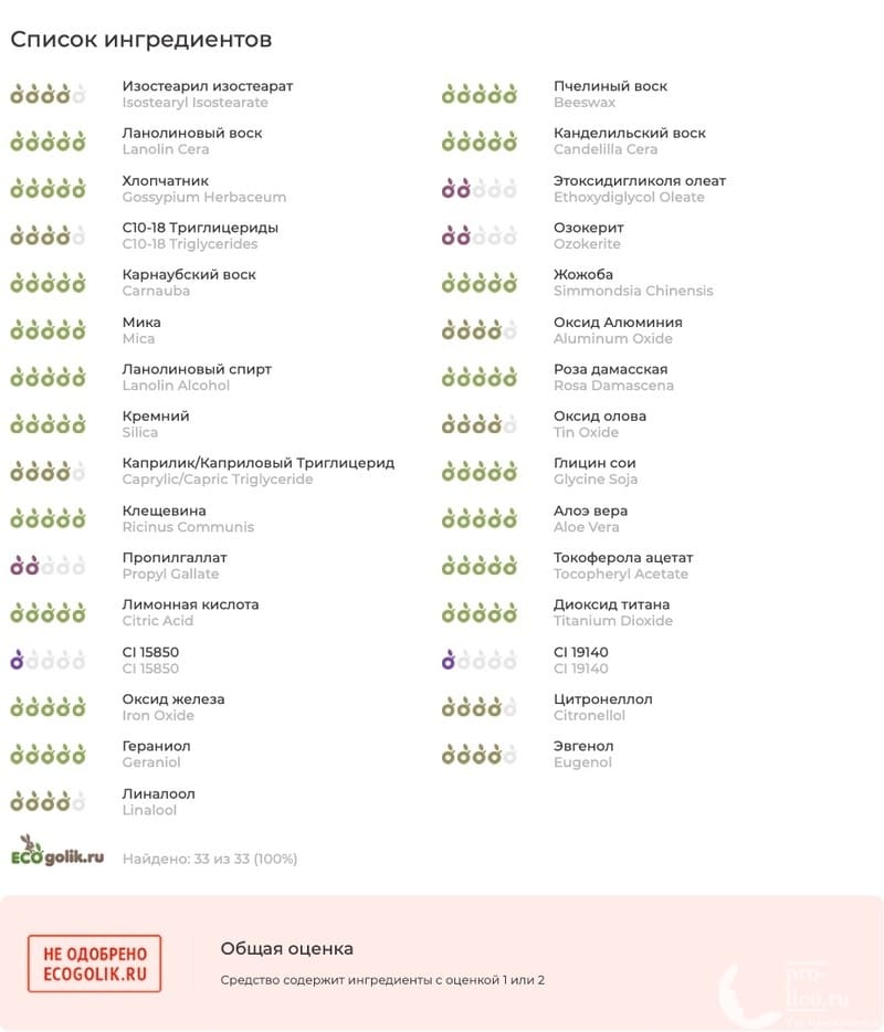 Анализатор космокис говорит, что 28 компонентов из 33 натурального происхождения, что отличный показатель. За исключением красителей, оставшиеся ингредиенты это: