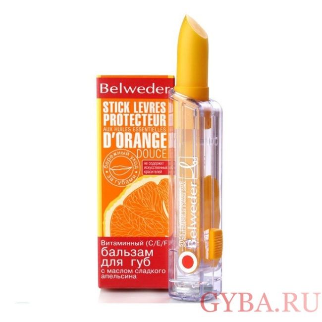 Это еще один очень популярный бальзам от фирмы Бельведер, который получил массу положительных отзывов. Это, так сказать, универсальное средство, которое позволяет комплексно ухаживать за кожей губ, защищая ее от неблагоприятных факторов внешней среды. В состав входит группа натуральных восков, как основа (канделлила, карнауба, пчелиный), масло жожоба для питания кожи, масло апельсина и группа активных витаминов (С, F, и Е). Спешим сказать, что особую роль в уходе играет именно витамин с, так как он повышать эластичность кожи, ускорять заживление, делает губы более молодыми и здоровыми. Использовать бальзам рекомендуют как детям, так и взрослым по мере необходимости. Наносить на чистые сухие губы.