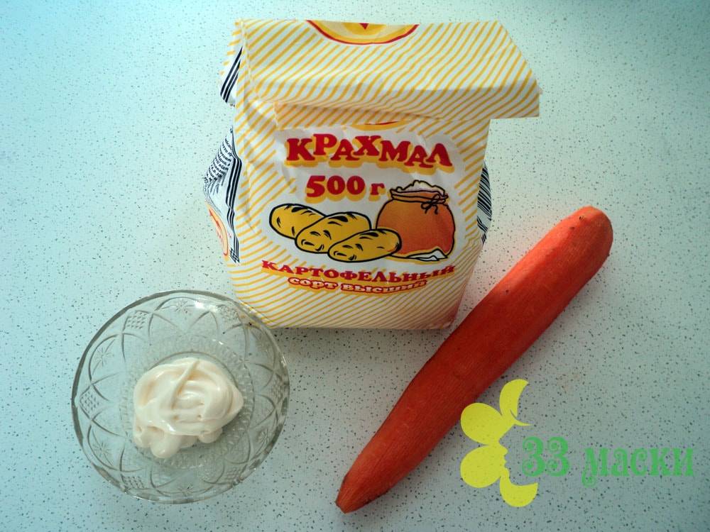 Выдавить морковный сок, нам понадобится 5 ст. л. крахмала растворить в 100 мл воды с фильтра, поставить на медленный огонь. Влить туда же 2 стакана кипятка и постоянно мешать. Как только смесь загустеет, снимаем с плиты. Ждем, пока остынет, добавляем сметану и морковный сок. Перемешиваем, наносим смесь на чистую кожу лица. Можно мазать в несколько слоев, затем подождать 20 минут и смыть.
