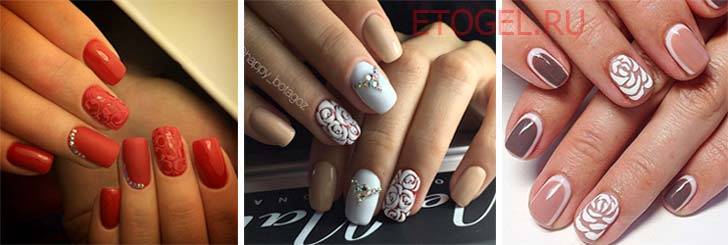 Маникюр с таким рисунком чаще всего делают в зимнее время года. Для того, чтобы подчеркнуть красоту узора, его присыпают бархатными крупинками. Свадебный маникюр. Невесты часто просят мастеров выполнить на ногтях рисунок в виде цветов и абстрактных узоров белым лаком. Посыпав рисунки песком, можно легко подчеркнуть отдельные узоры, сделать акцент на безымянном пальце.